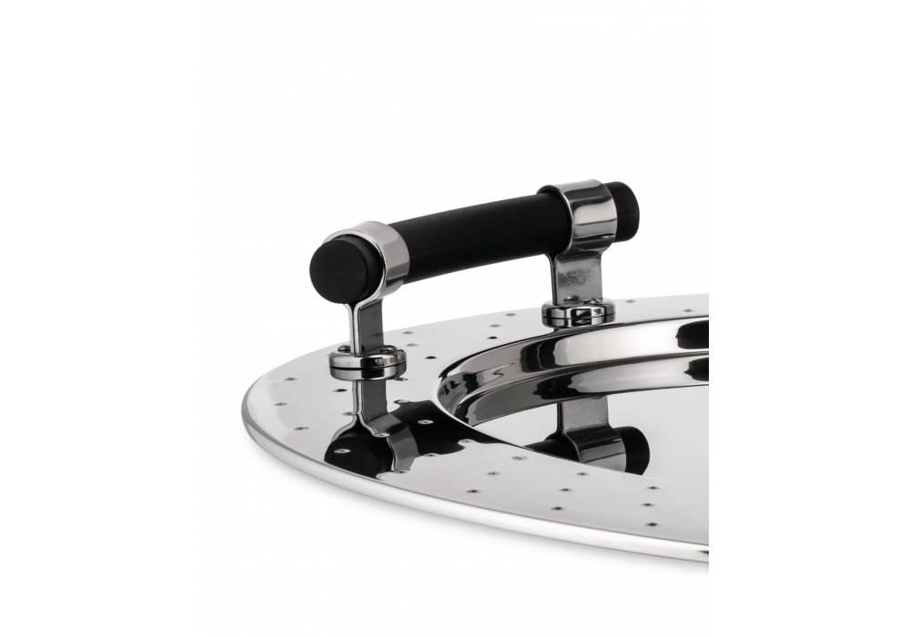 MG09 diseñada por Michael Graves para Alessi es una bandeja ovalada realizada en acero inoxidable 18/10 con asas de resina termoplástica negra.