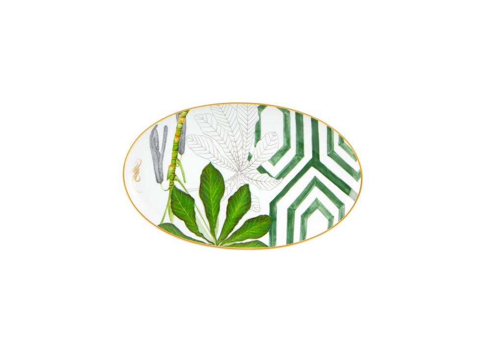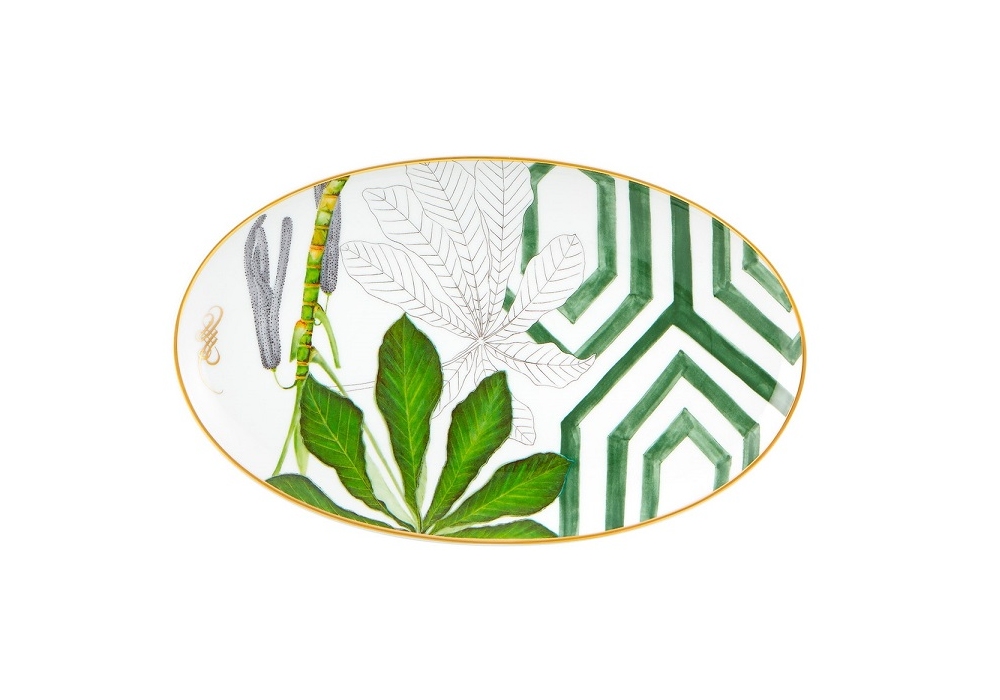 Amazōnia diseñada por Vista Alegre con Ecoarts es una bandeja ovalada en porcelana con detalles dorados que representan flora y fauna. Disponible en diferentes modelos.