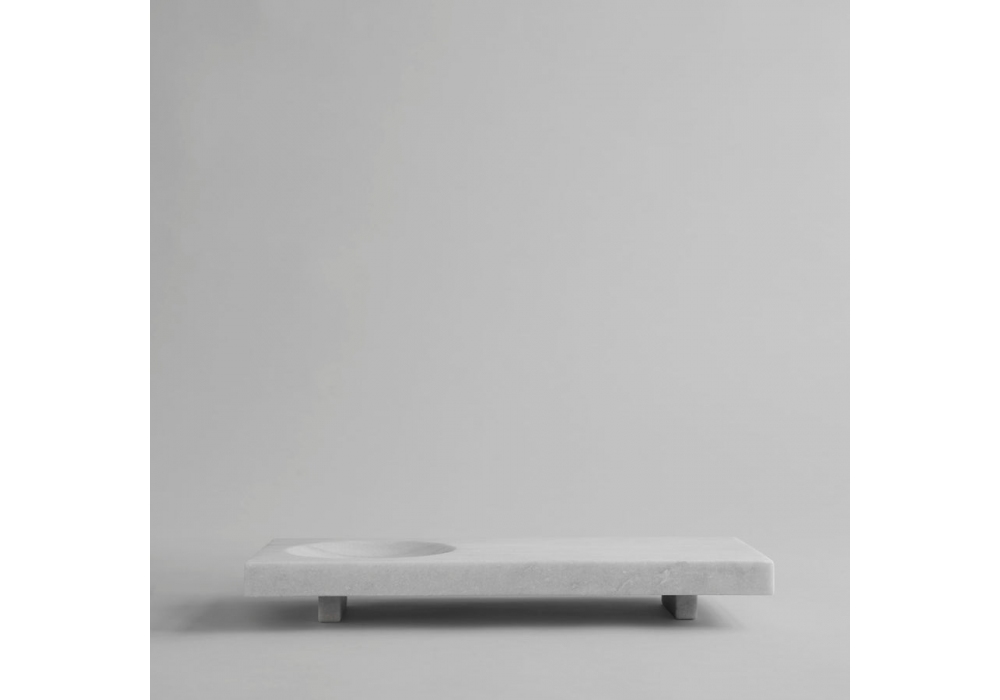 Oka diseñada por Kristian Sofus Hansen & Tommy Hyldahl para 101 Copenhagen es una bandeja realizada en mármol blanco o en fibrocemento en acabado color café.
