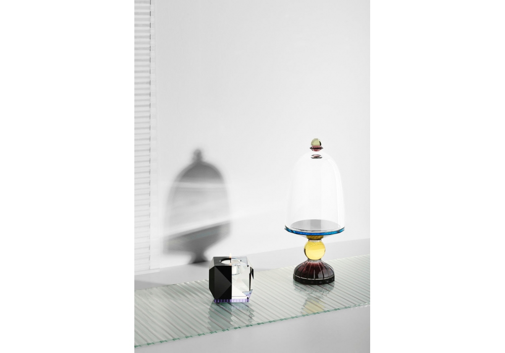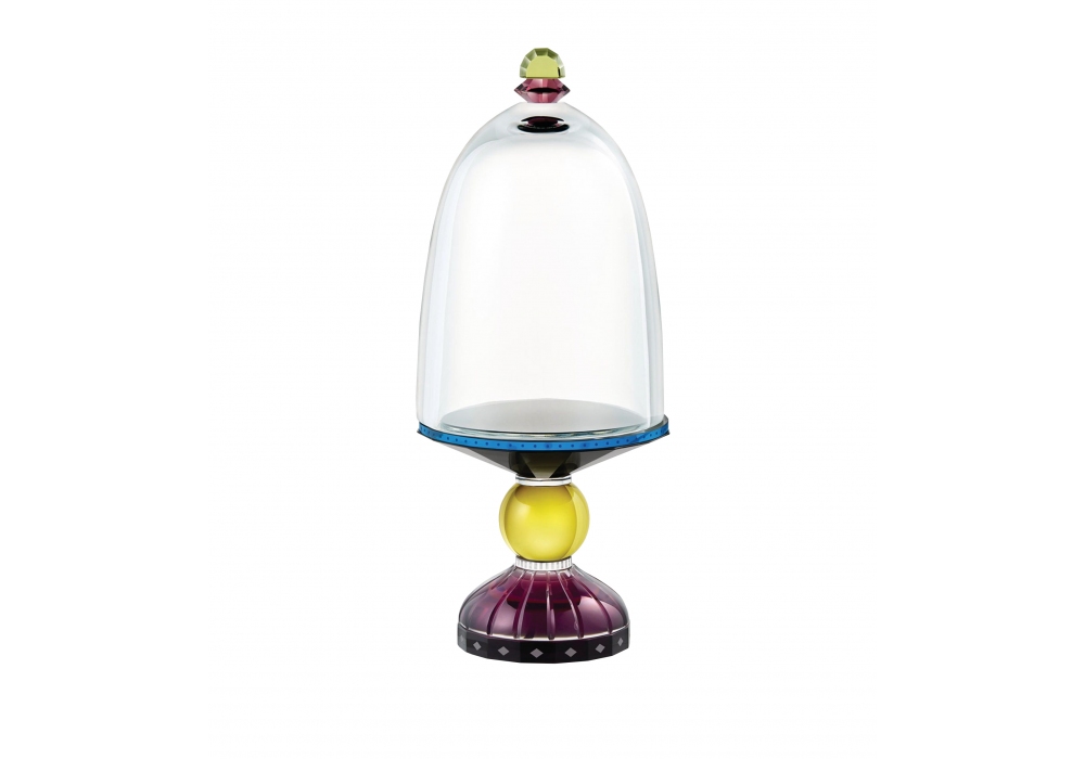 Empire producido y firmado por Reflections Copenhagen es un soporte para pasteles en forma de campana en cristal estructurado por varios elementos geométricos tallados y terminados a mano en transparente, negro, azul y amarillo.