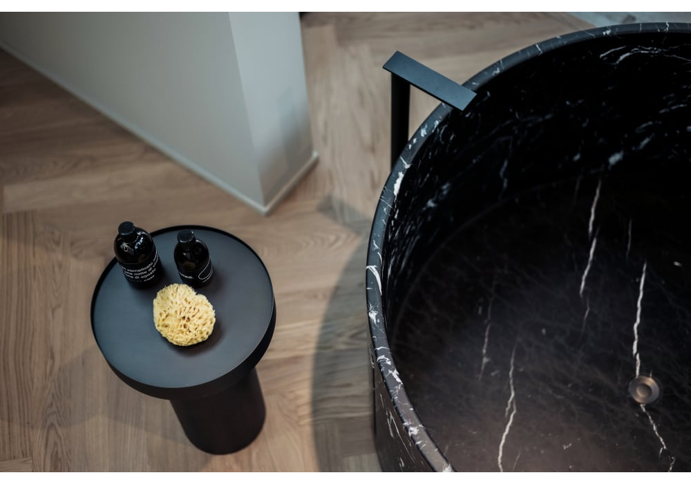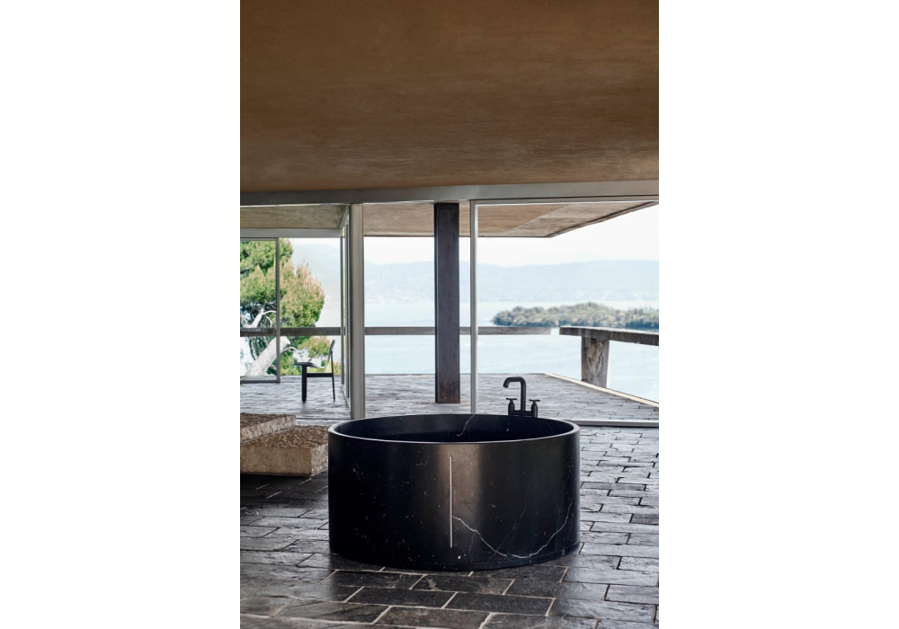 In-Out diseñada por Benedini Associati para Agape es una bañera con lavabo redondo realizada en mármol en diferentes acabados. Dispone de desagüe sifón cromado con rebosadero integrado. La grifería se puede colocar en la pared o en el suelo.