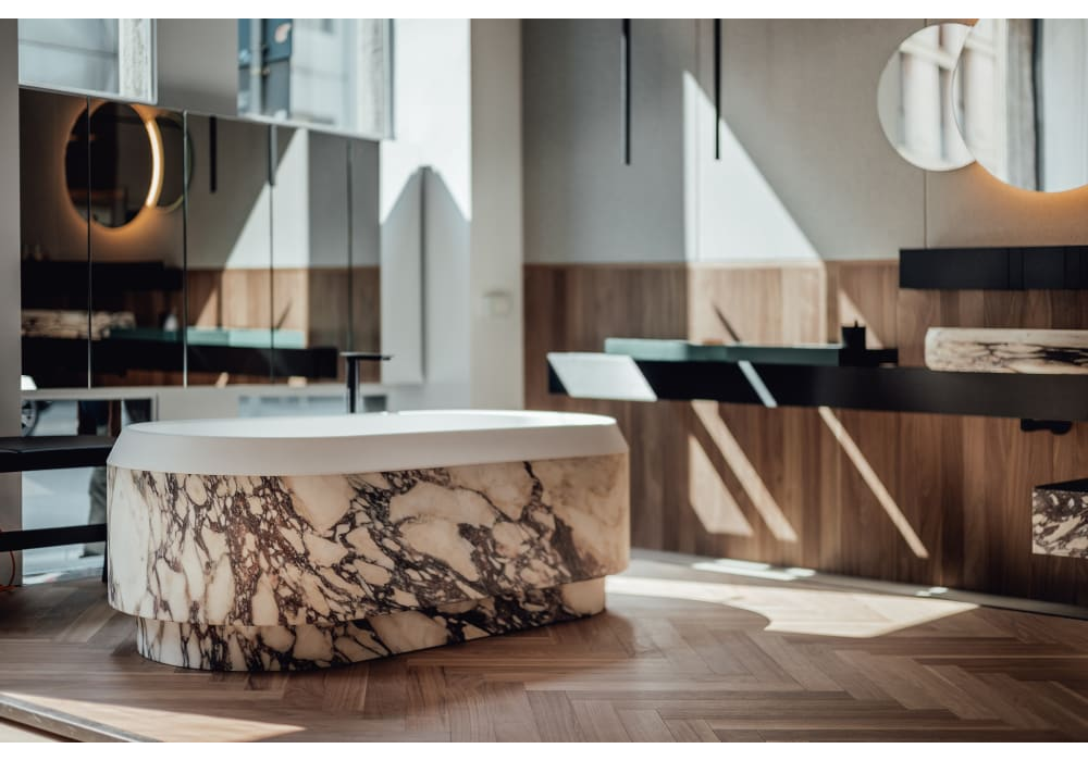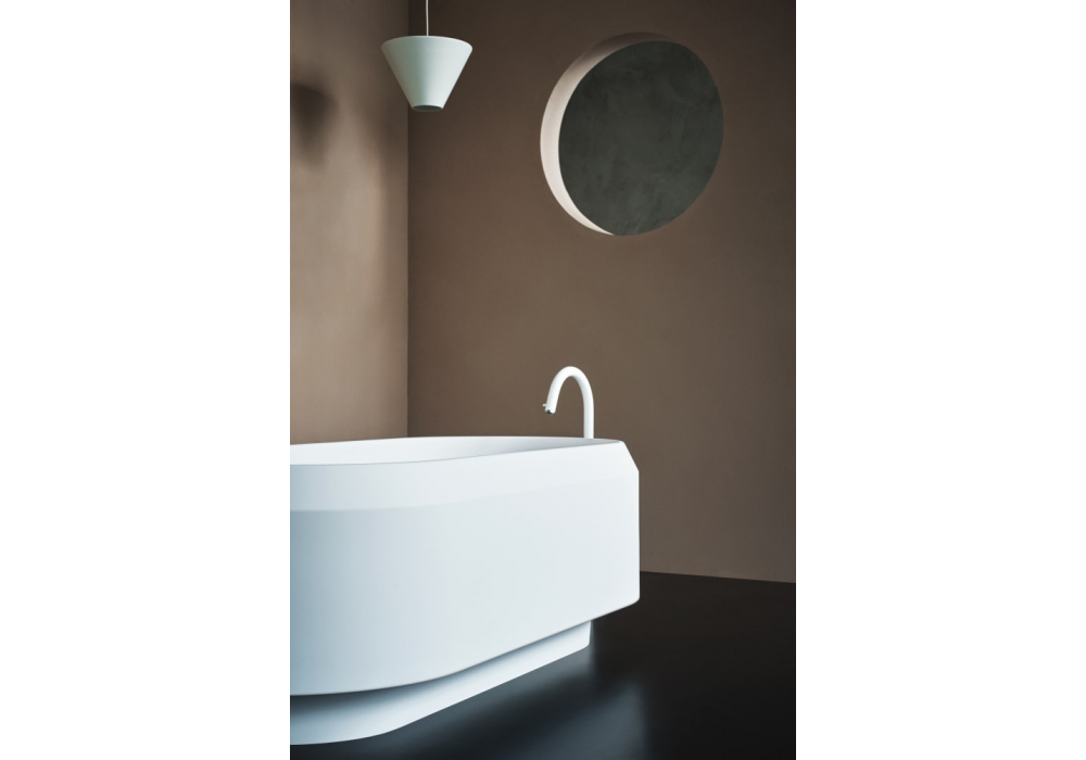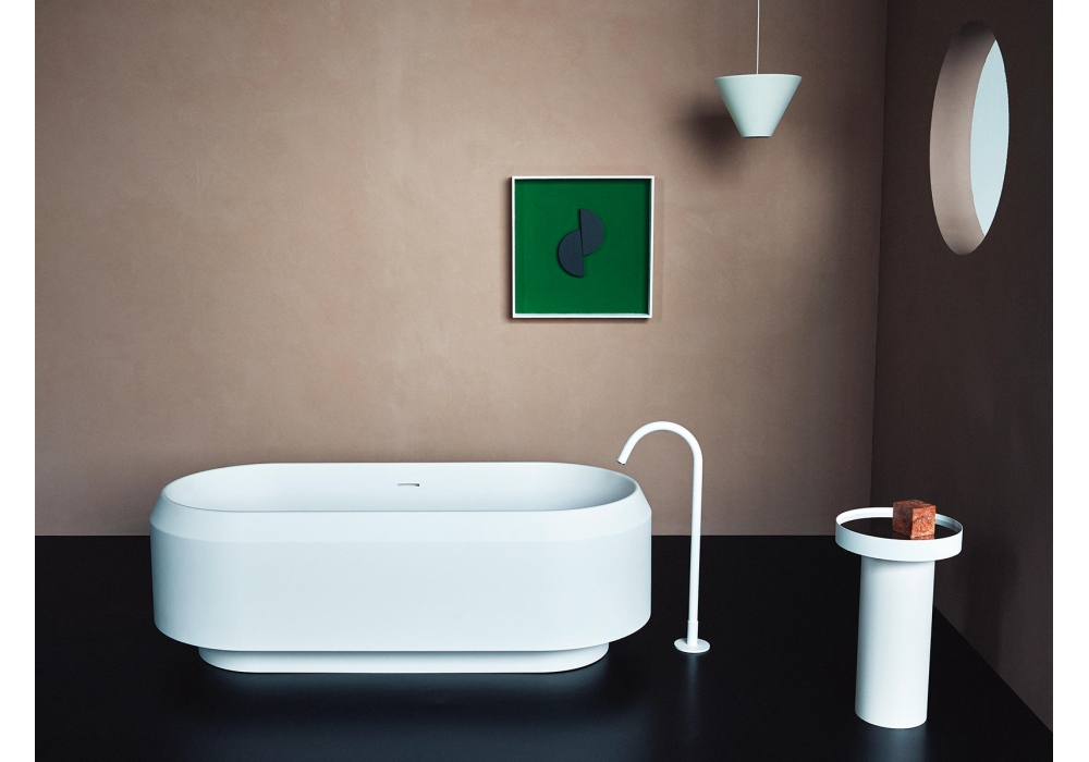 Lariana diseñada por Patricia Urquiola para Agape es una bañera en Cristalplant® blanco o bicolor o con parte exterior en mármol en diferentes acabados. Equipada con orificio rebosadero. No tiene orificios para grifería, ésta puede colocarse en la pared o en el suelo.