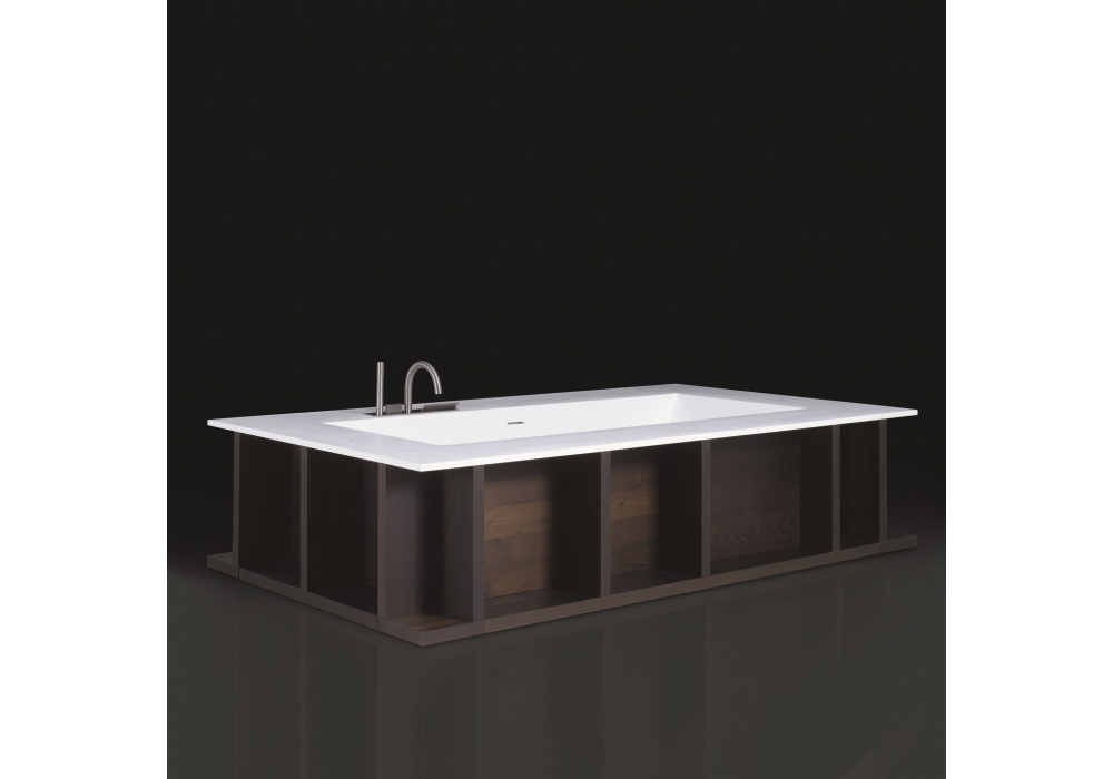 Swim C diseñada por Piero Lissoni para Boffi es una bañera en Cristalplant® blanco con compartimentos abiertos. Disponible en varios acabados: madera y Ecolak.