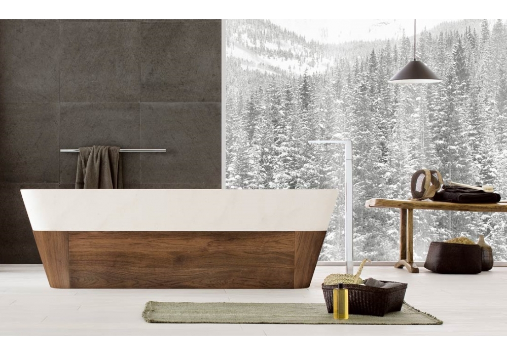 Duo diseñada por Matteo Thun & Antonio Rodriguez para Neutra es una bañera tallada en un bloque único de piedra disponible en diferentes acabados. También disponible en 3 modelos: estándar, con base en madera o con superficie en madera Kauri en disponibilidad.