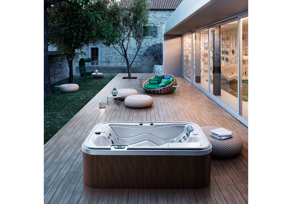 MySpa 216/165 diseñado por Glass Lab est un balneario spa portátil con 22 chorros de hidromasaje, cromoterapia, calentador (3kW), bombas de 1 velocidad (3 hP), bomba de recirculación, filtros de cartucho (15m²), sistema de ozono, reposacabezas. Termocambiador y kit de audio bluetooth como opcional. Cubierta térmica gris obligatoria. Bajo pedido, es también disponible una versión para instalación incorporada.