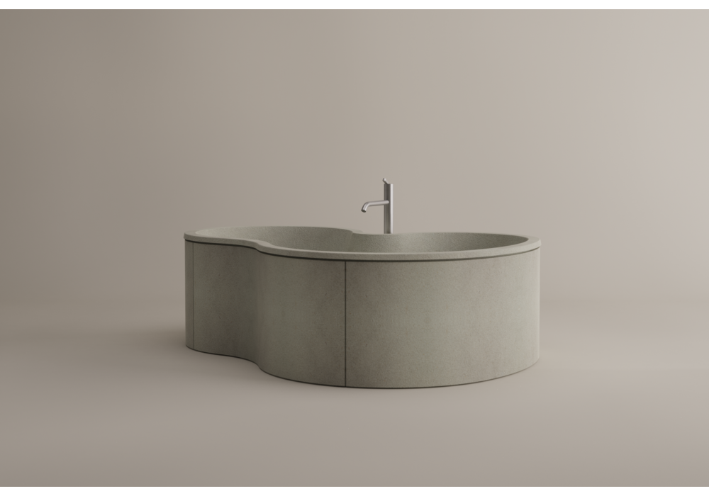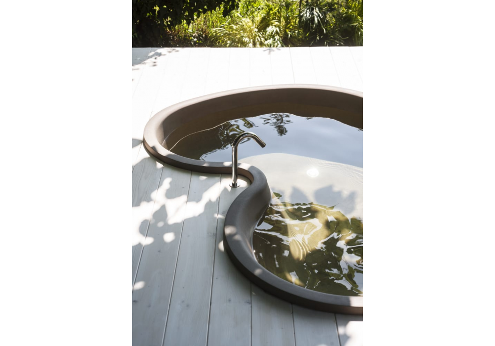 DR Cemento Outdoor diseñada por Studio MK27, Mariana Ruzante y Marcio Kogan para Agape es una bañera realizada en Cementoskin® disponible en diferentes acabados. Disponible en la versión exenta con paneles externos de acabado en madera contrachapada fenólica de okumé con revestimiento de resina de cemento del mismo color que la bañera o sin paneles externos para la versión empotrada. Rebosadero integrado en el desagüe cromado incluido. Sin orificios para grifería.