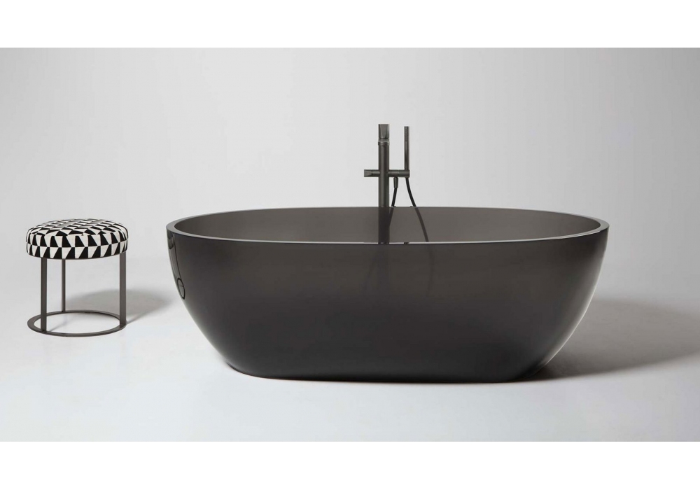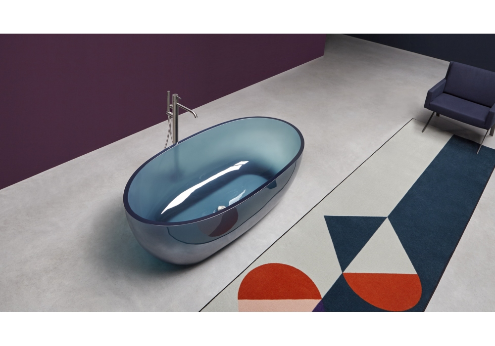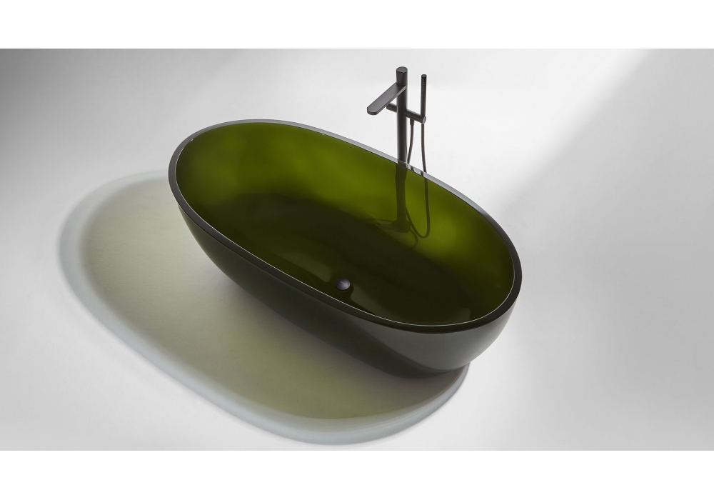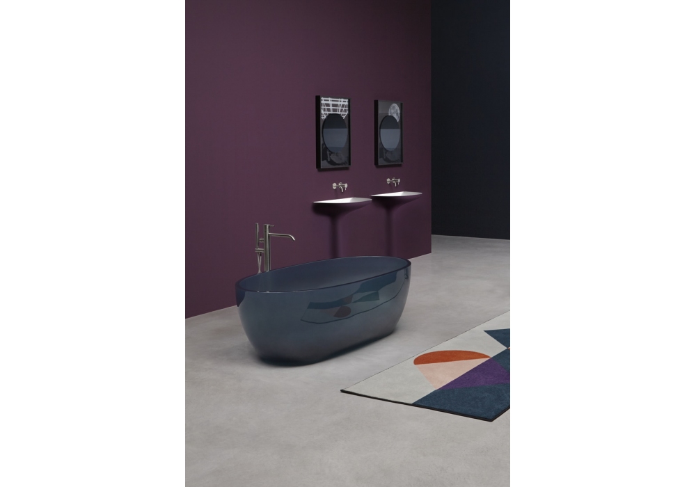 Reflex diseñada por Antonio Lupi es una bañera ovalada en Cristalmood o Icemood disponible en varios colores, completa con desagüe con sistema de drenaje a presión click-clack, sifón y tubo flexible.