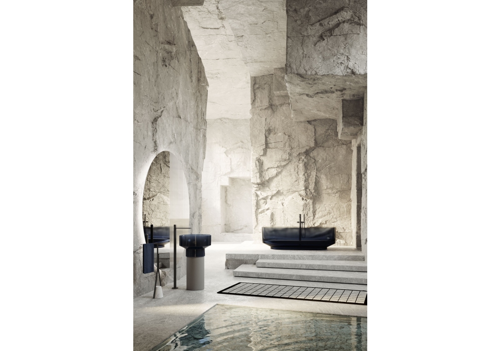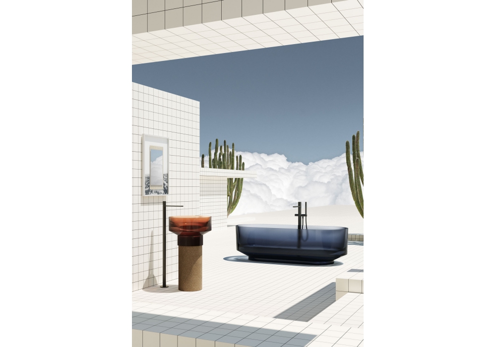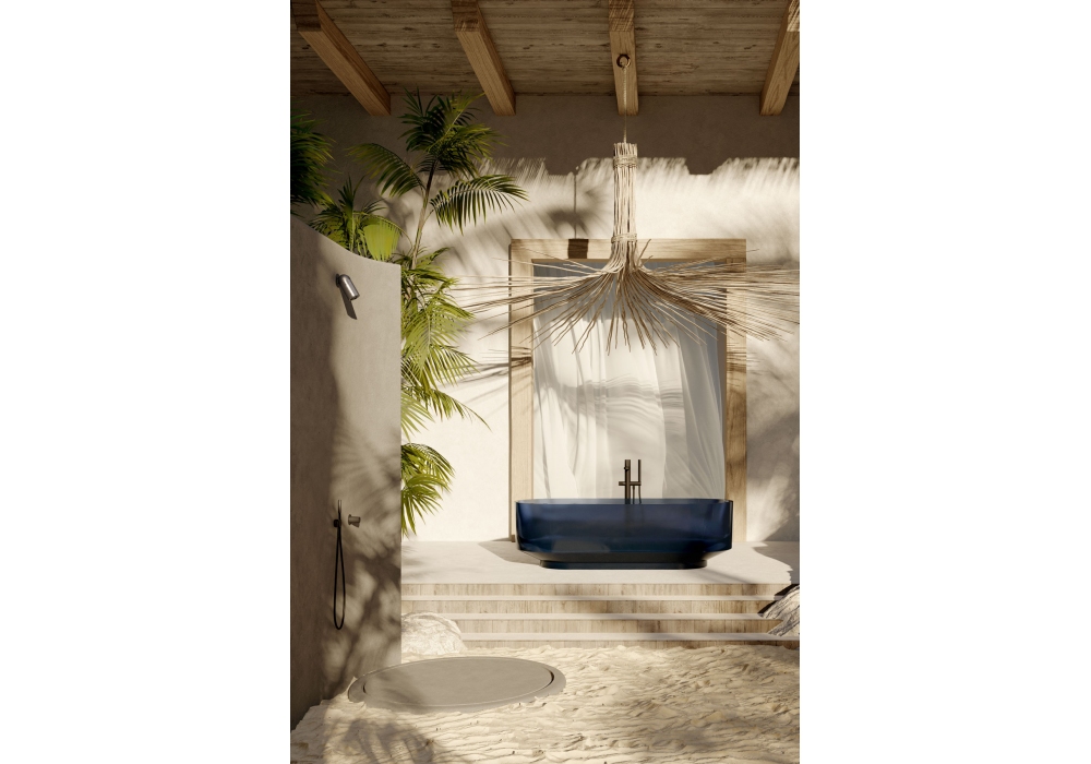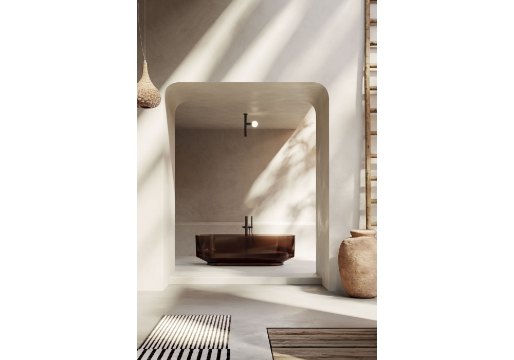Borghi diseñada por Gumdesign para Antonio Lupi es una bañera ovalada en Cristalmood o Icemood o en piedra disponible en varios colores, completa con desagüe con sistema de drenaje a presión click-clack, sifón y tubo flexible.