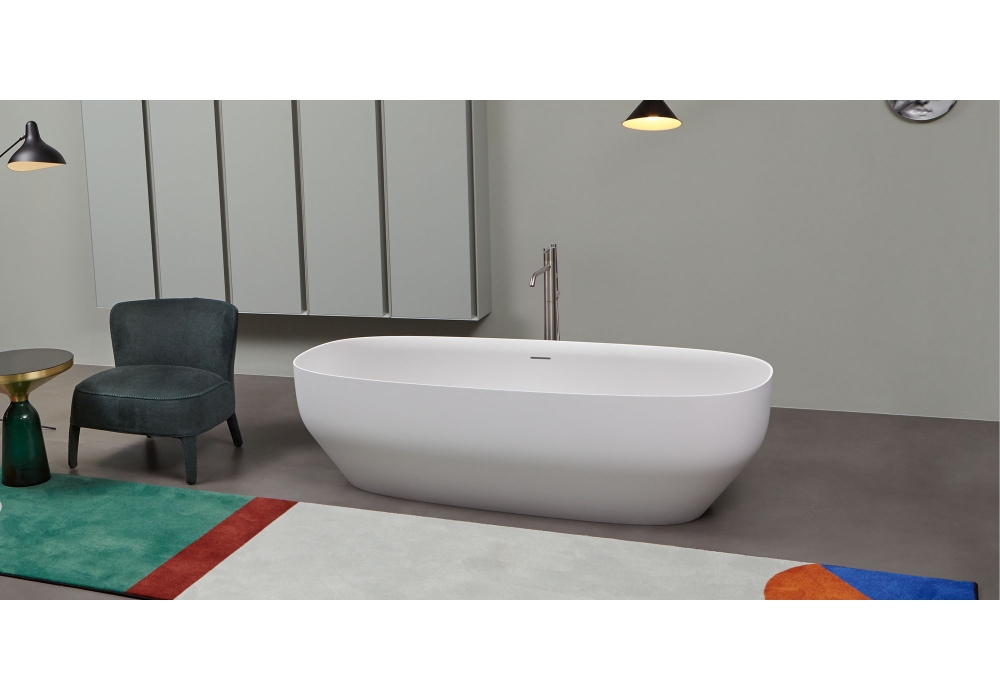 Ago diseñada por Mario Ferrarini para Antonio Lupi es una bañera ovalada en Cristalplant, pintable exteriormente, completa con desagüe con sistema de desagüe a presión click-clack, sifón y flexible.
