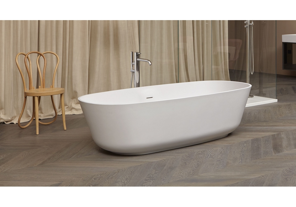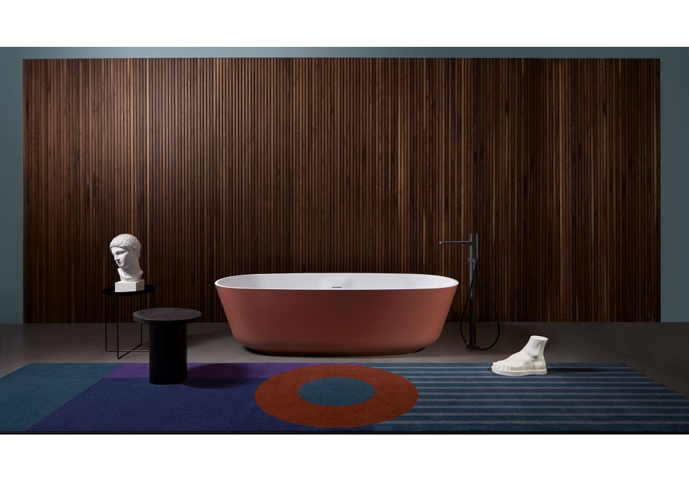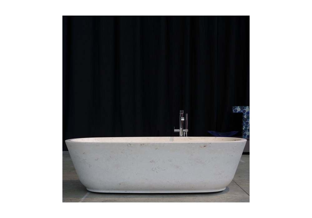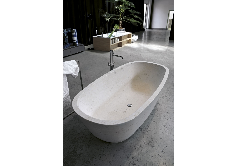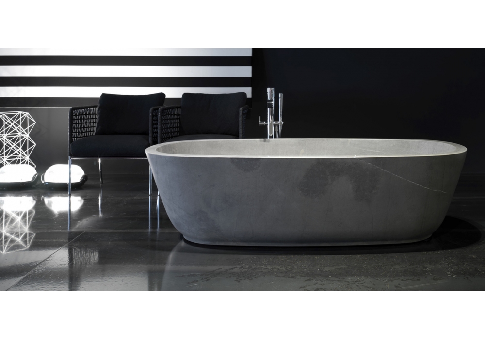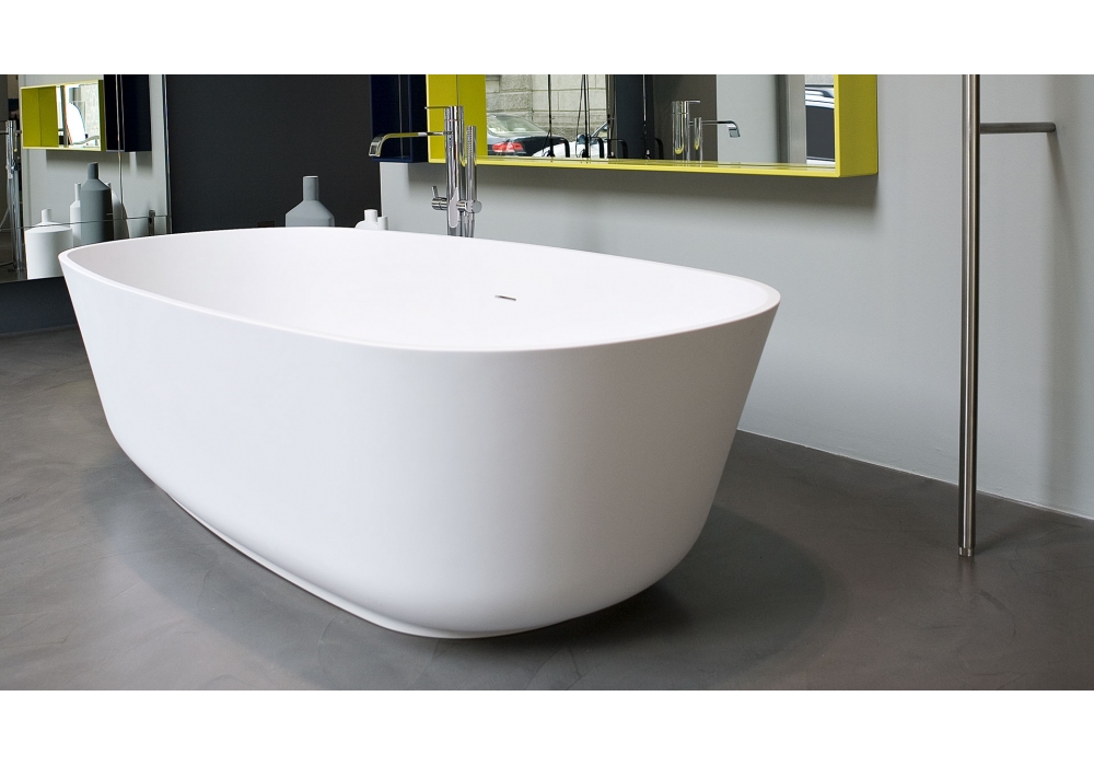 Baìa diseñada por Carlo Colombo para Antonio Lupi es una bañera ovalada en Cristalplant o piedra, pintable exteriormente, completa con desagüe con sistema de drenaje a presión click-clack, sifón y tubo flexible.
