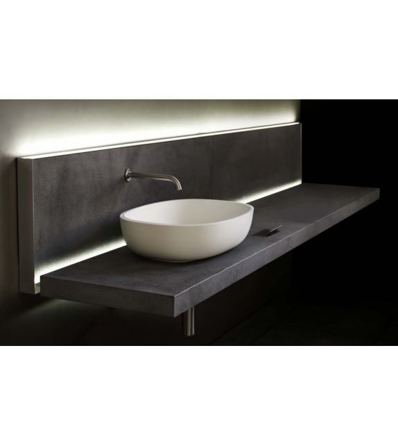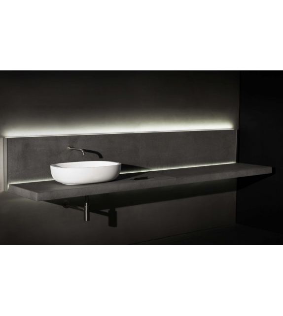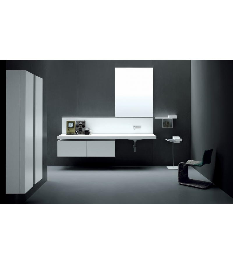 Flyer diseñado por Monica Armani es un sistema de encimera y almacenaje que se divide en varios elementos: la encimera del lavabo con elevador e iluminación integrados, los muebles bajos suspendidos con cajones, las columnas con puertas batientes. Disponible en diferentes acabados. Contacta con nuestro servicio de atención al cliente para diseñar tu unidad.
