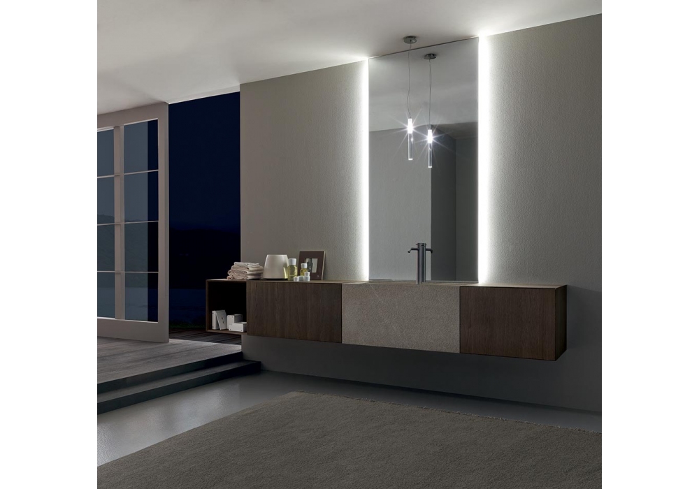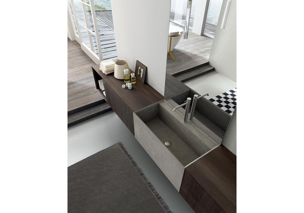 More diseñado y producido por Modulnova es un sistema de baño con acabado abatible de las bases de roble y lavabo de piedra con borde de 45°. El sistema también incluye una pared de resina detrás, pero cada elemento puede estar hecho de los más diversos materiales, con técnicas de procesamiento específicas que mejoran la calidad de la materia prima utilizada. Contacta con nuestro Servicio de Atención al Cliente para configurar el sistema Más como prefieras.