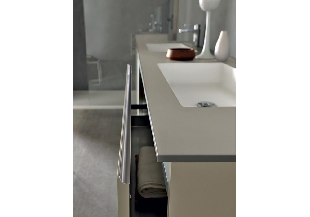 Light diseñado y producido por Modulnova es un sistema de baño con bases en gris humo súper mate y encimera en laminado del mismo color, con lavabo integrado en Tecnoril blanco mate. Cada elemento de esta composición se puede realizar en otros materiales (roble, fenix, nogal, lacado, laminado y otros) y acabados, con una amplia variedad de soluciones creativas. Contacta con nuestro Servicio de Atención al Cliente para configurar el sistema de baño Light como prefieras.