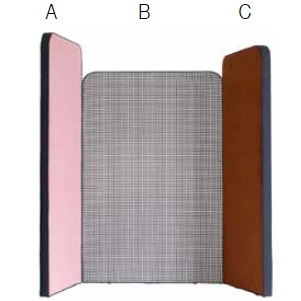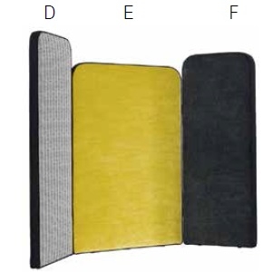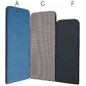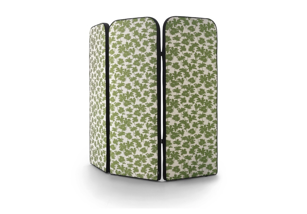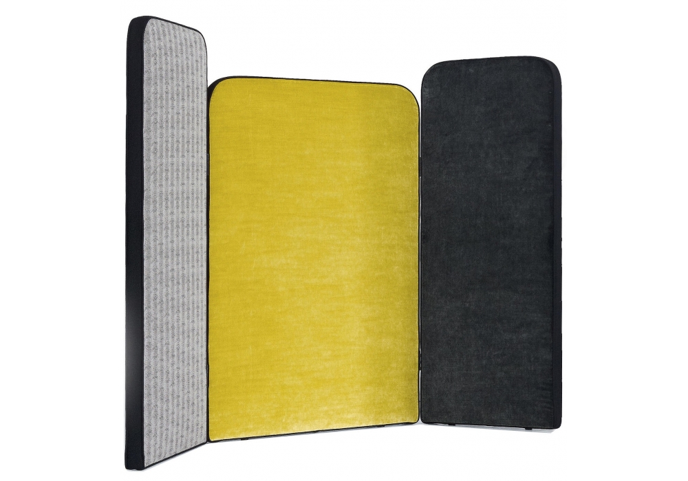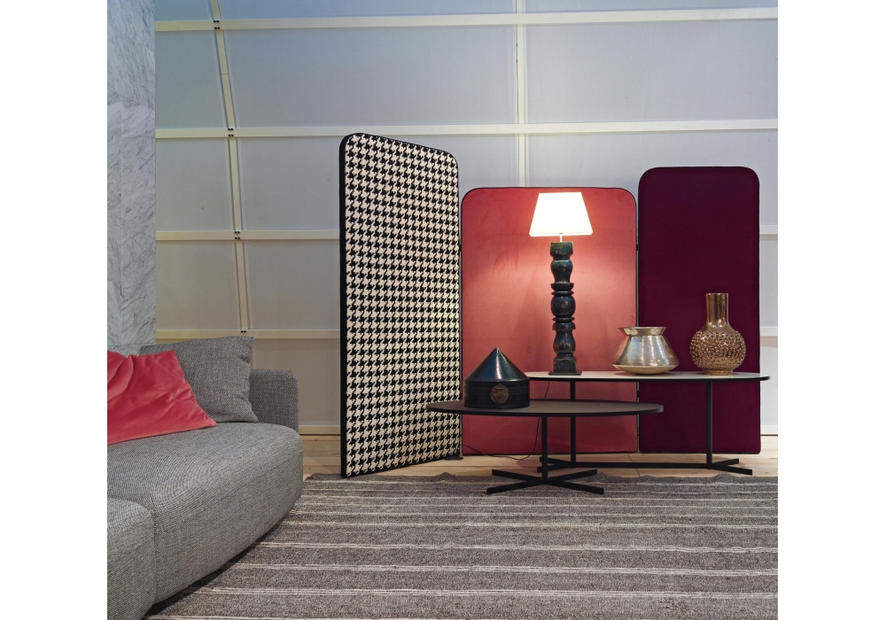 Diva diseñado por Bernhardt & Vella para Arflex es un biombo modular compuesta por paneles con estructura de contrachapado de álamo, acolchado en fibra de poliéster y revestimiento en tejido. Pies ajustables de PVC negro.