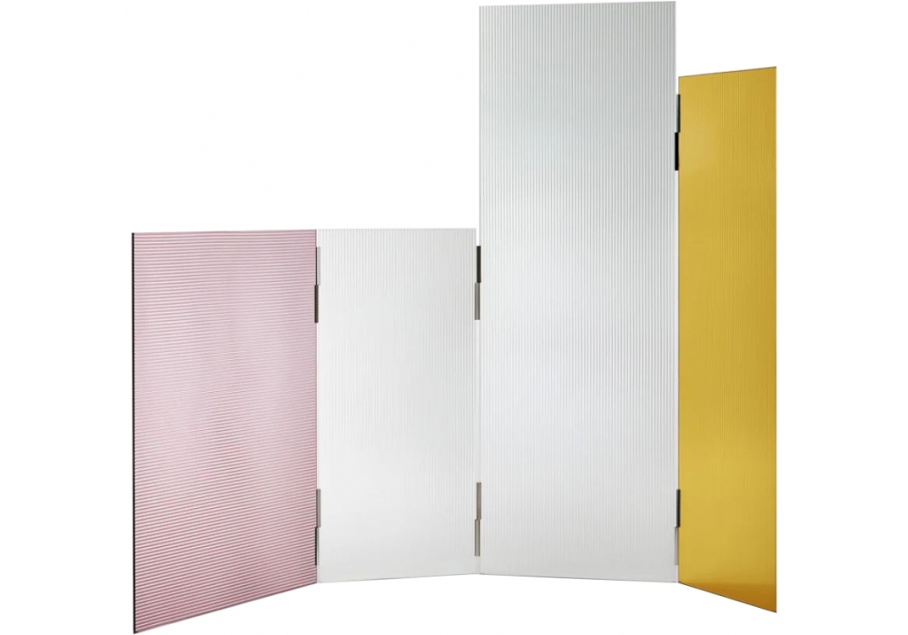 Rayures, diseñado por Ronan y Erwan Bouroullec para Glas Italia, es un biombo modular con paneles abatibles de vidrio Flutes laminado y templado. También está disponible un espejo que puede colocarse en un extremo de la composición. La veta del cristal es horizontal o vertical, según el formato del panel. Las bisagras son de latón cromado antracita.