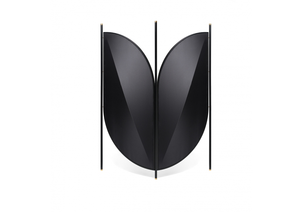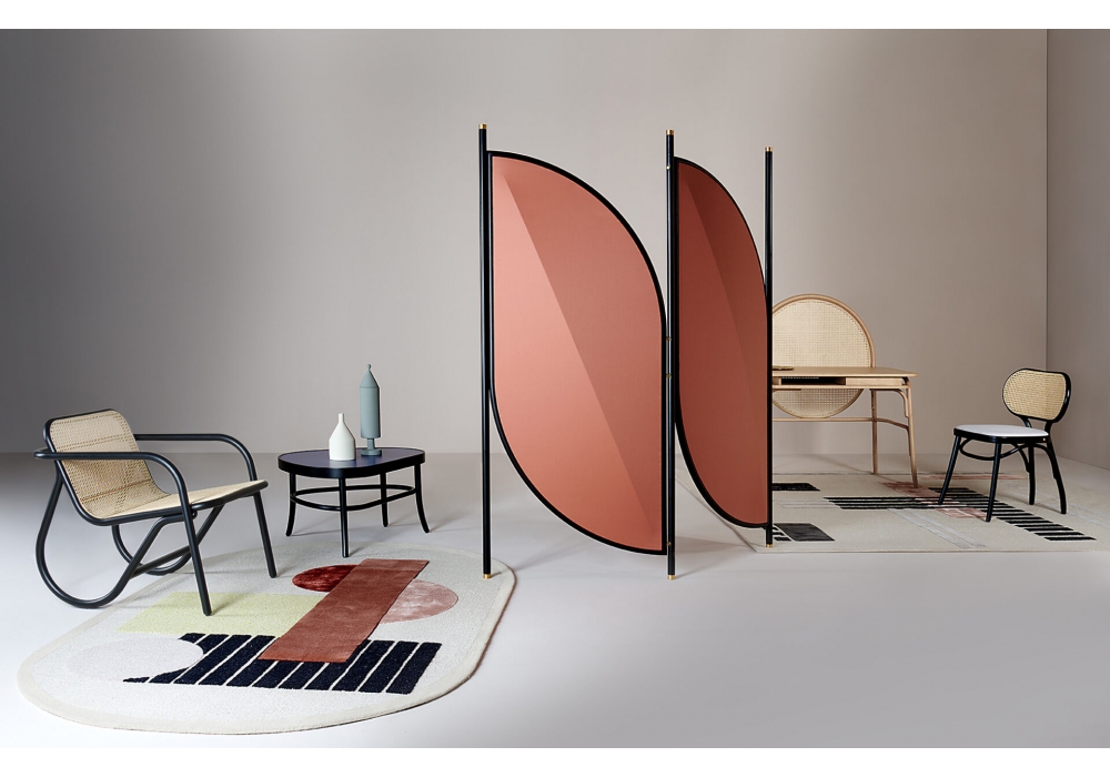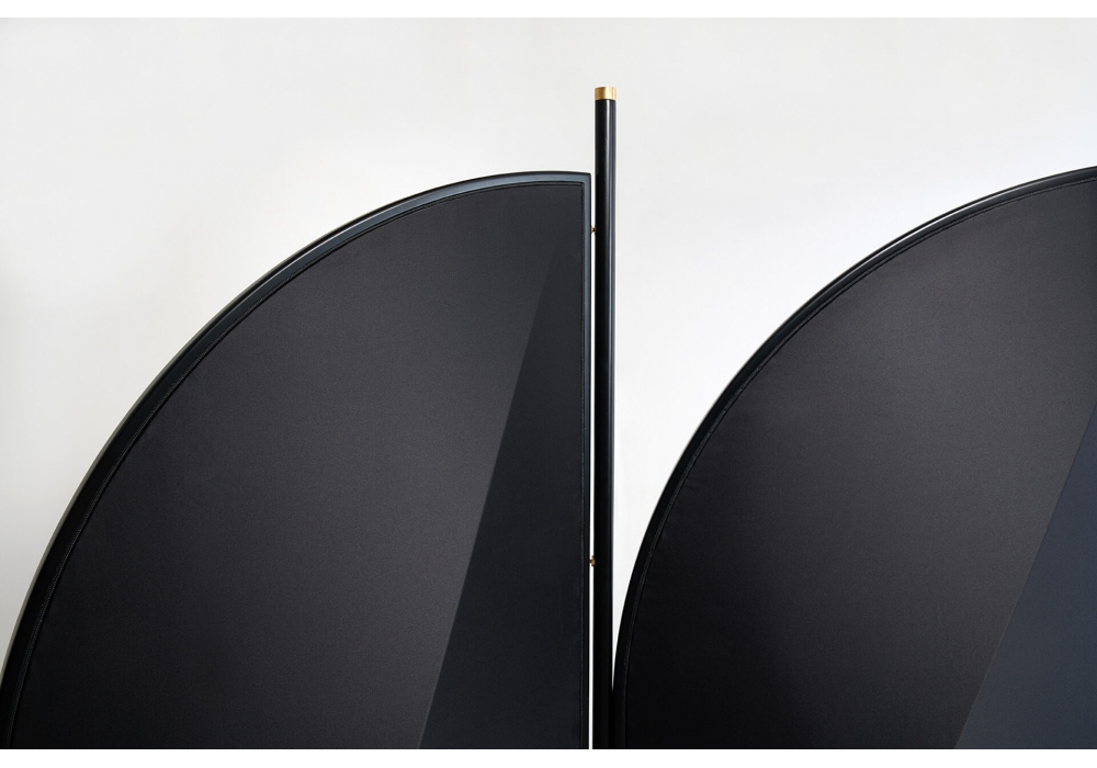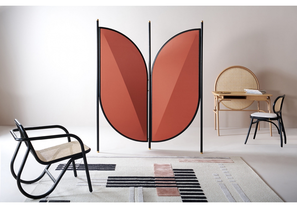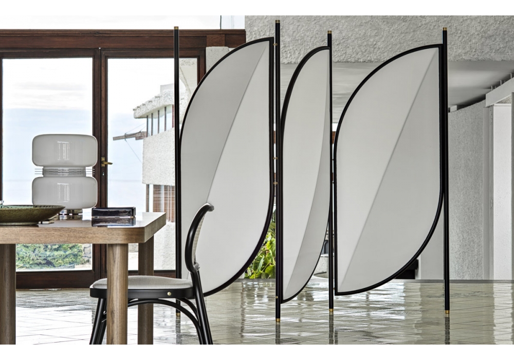 Feng diseñada por Testatonda para Gebrüder Thonet Vienna es una mampara con estructura en haya curvada y paneles divisorios en tejido estirado disponible en diferentes acabados, estructura metálica con detalles en latón. Disponible con dos o tres paneles divisorios.