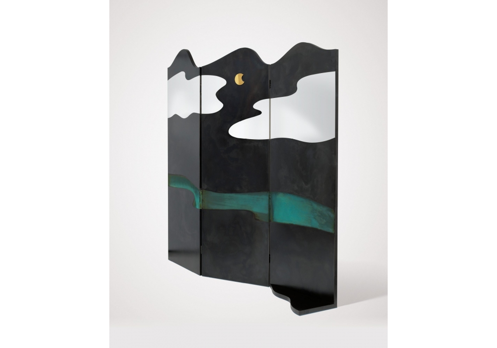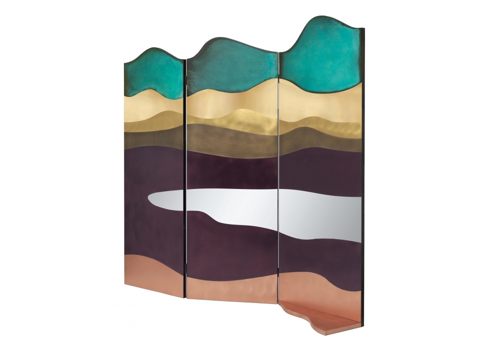 El cuadro diseñado por Alessandra Baldereschi para DeCastelli es un divisor de edición limitada, realizado en diferentes metales y acabados para componer un paisaje montañoso diurno por un lado y nocturno por el otro.