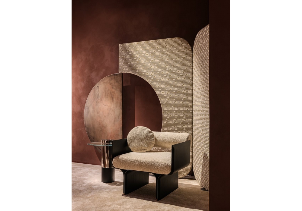 Enso diseñado por Studio G&R para Gallotti&Radice es un biombo compuesto por dos paneles de madera revestidos con tela Utopia plata 101 o Sagi plata 022 y un panel de madera móvil en forma de medialuna con efecto bruñido. Patas metálicas lacadas en color gunmetal. Revestimiento no desenfundable.