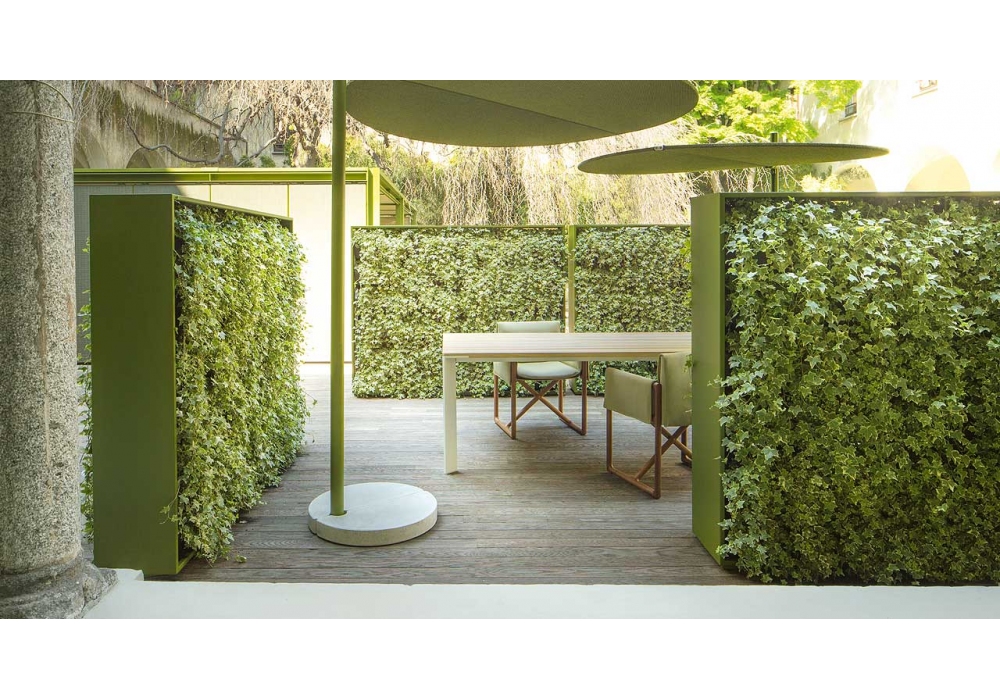 Greenery diseñado por CRS Paola Lenti es un muro vegetal vertical diseñado para dividir y decorar espacios al aire libre. Las superficies verticales consisten en contenedores de plantas extraíbles. Estructura de doble cara en acero pintado en diferentes acabados.