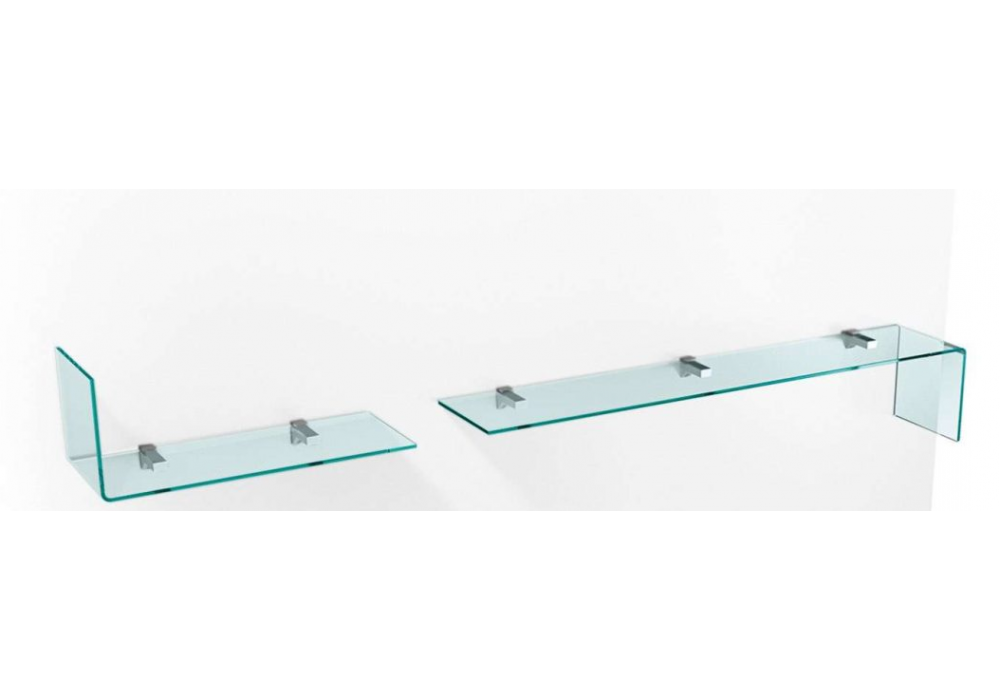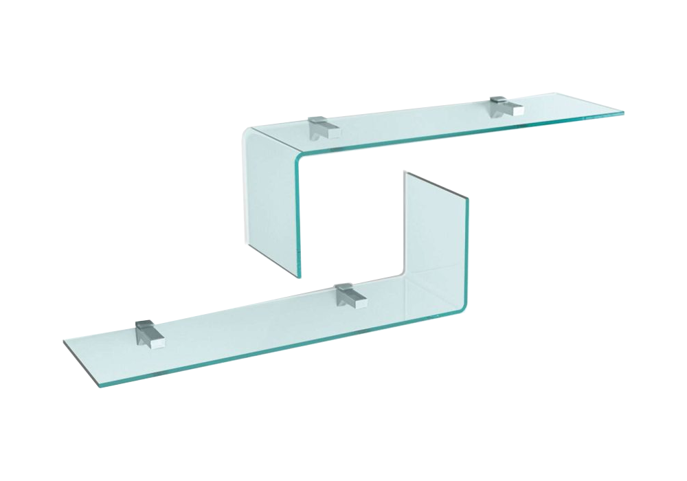 Rialto L diseñado por CRS Foam para Foam es un estante en vidrio curvado y soporte de estante en metal cromado. Disponible en diferentes tamaños.