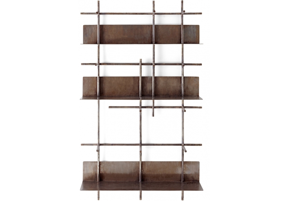 Navigli designed by Massimo Castagna for Gallotti&Radice is a wall shelving system with hand burnished copper structure and shelves. The hand burnished copper finish looks naturally spotted and irregular. Due to this craftmade processing, each product is unique and exclusive.