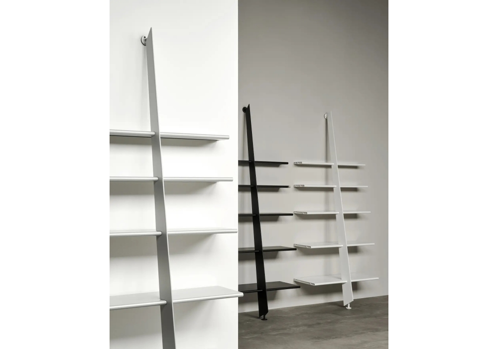 Mac Gee diseñada por Philippe Starck para Baleri Italia es una hermosa estantería modular en lámina de acero pintado con polvo epoxi en negro mate, blanco y plata metálica, constituida por un pilar central y cinco estantes de profundidad decreciente.