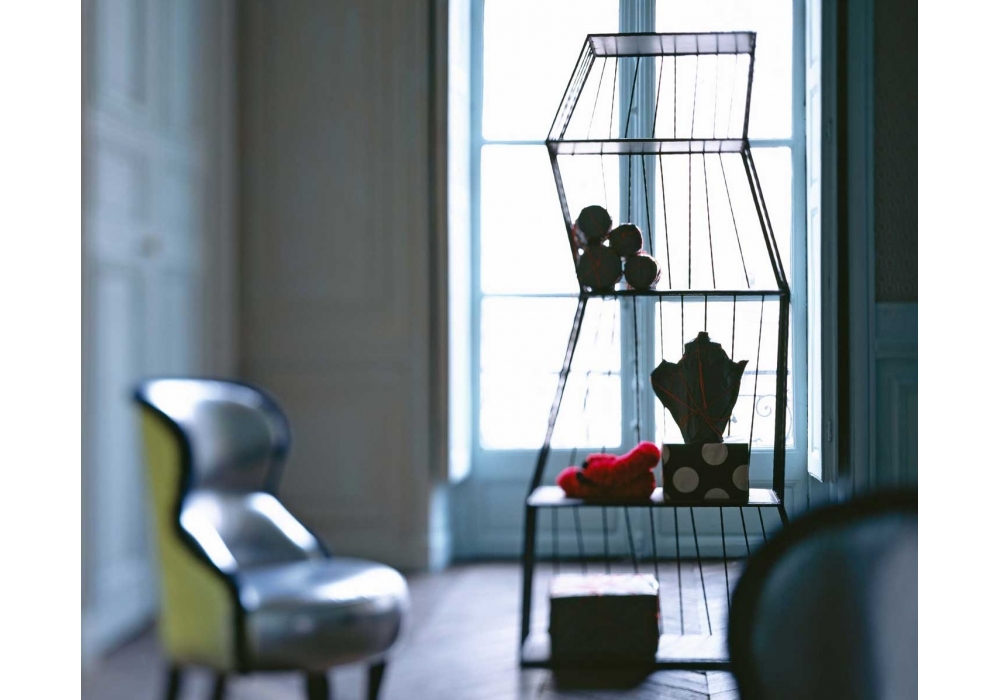 Babele firmada por Paola Navone para Baxter es una líbreria con estructura estructura en hierro forjado y martillado. Estantes de metal con sobre en cuero.
