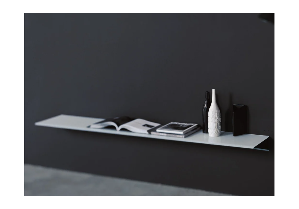 On diseñada por Ennio Arosio para Glas Italia es una serie de estantes realizadas con dos cristales templados laqueados mates o laqueados brillantes mm. 8 pegados entre ellos y soportados por una cuña de metal fijada en la pared. Disponible en 4 dimensiones.