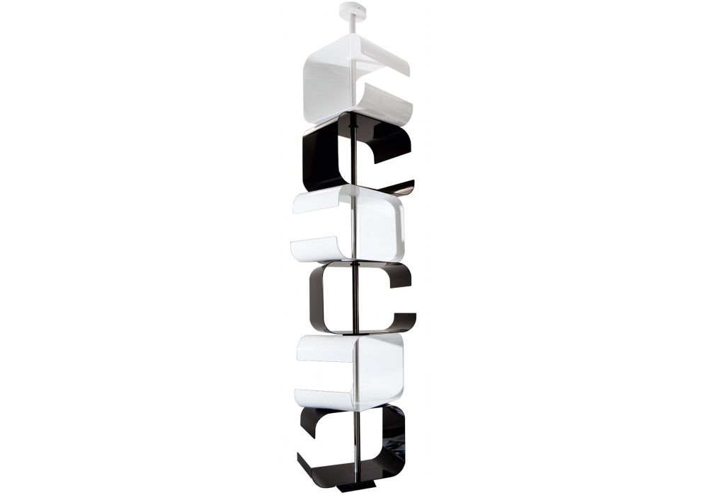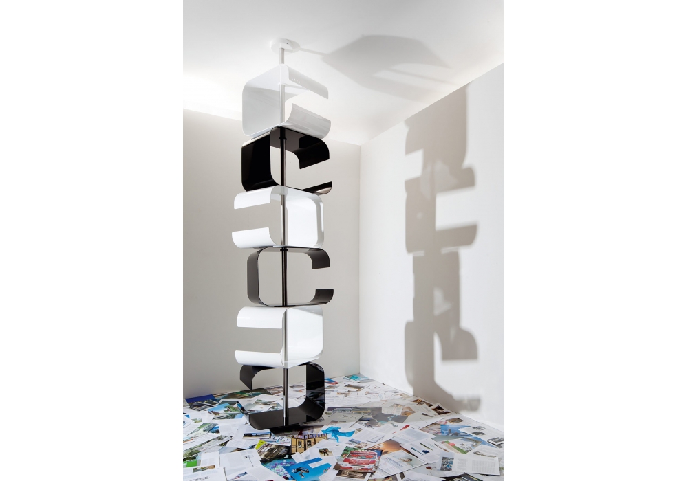 Tico diseñada por Franco Zavarise para Zava es una biblioteca modular realizada en aluminio, hierro y acero pintado mate. En la versión grande, el tubo de soporte central se puede ajustar según la altura de la habitación. Disponible en diferentes medidas y acabados.