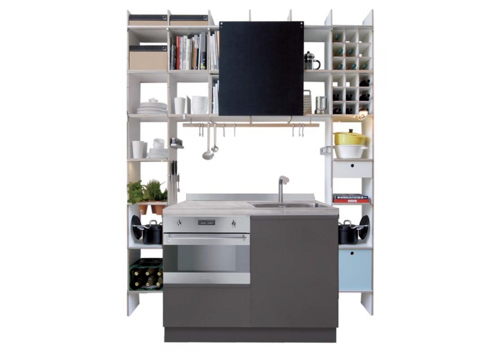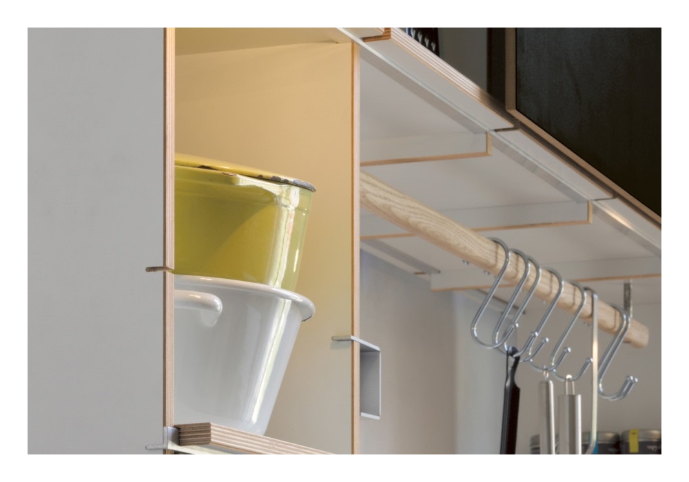 FNP Kitchen diseñada por Axel Kufus & Nils Holger Mormann para Moormann es un sistema de estantes con estructura y estantes en contrachapado de abedul, disponible en diferentes acabados. Puede combinarse cómodamente con los módulos de cocina más diversos, de gama alta a bajo presupuesto.
