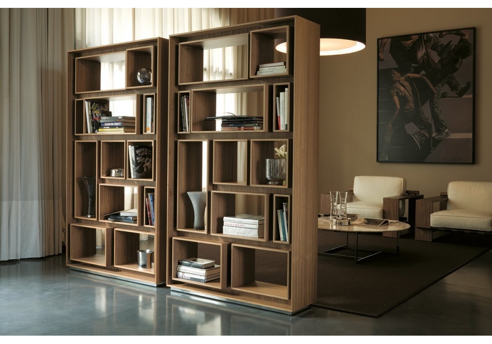 First diseñada por Gino Carollo para Porada es una libreria en nogal canaletta o roble spessart y base de metal en acabado de acero. Perfecta para ser combinada con la libreria Fancy.