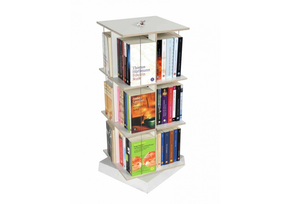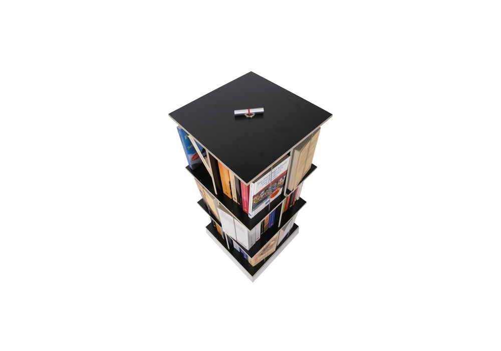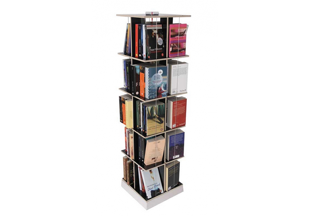Moormann Buchstabler bookcase: TOM FISCHER, 2004. is a pivotable rack for pocket books. With purchases kept on a minimum, a maximum amount of books is stored in a space-saving way and clearly arranged. The rack is stuck together, stands freely and detached and - if necessary - it can become higher and higher. Therefore, it is possible to assemble Buchstabler at coffee-table height (two levels), up to Buchstabler-tower height (seven levels). Buchstabler is stabilized with a simple, but clever technique:. a string connects the base and the top of the shelf. The tension, produced from twisting the string, holds the shelf tightly together. It becomes nearly invisible when completely filled with pocket books, so that it leaves the stage to the printings which thus can display themselves on their best behaviour (front). A base made of cast conctete makes the rack stable.