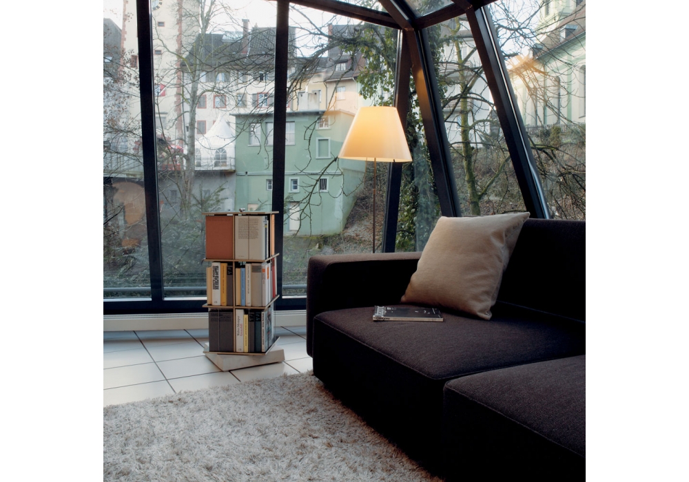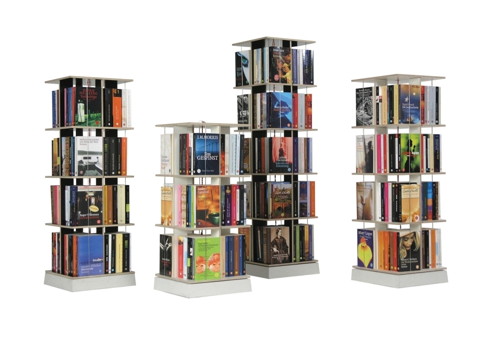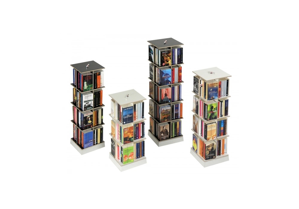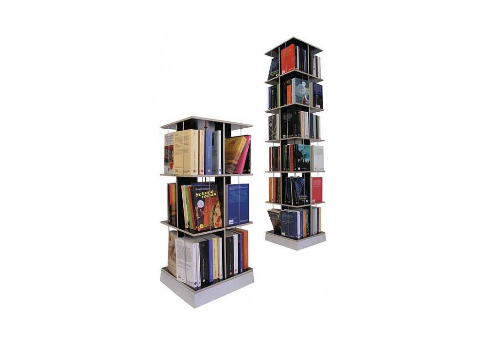 Moormann Buchstabler bookcase: TOM FISCHER, 2004. is a pivotable rack for pocket books. With purchases kept on a minimum, a maximum amount of books is stored in a space-saving way and clearly arranged. The rack is stuck together, stands freely and detached and - if necessary - it can become higher and higher.