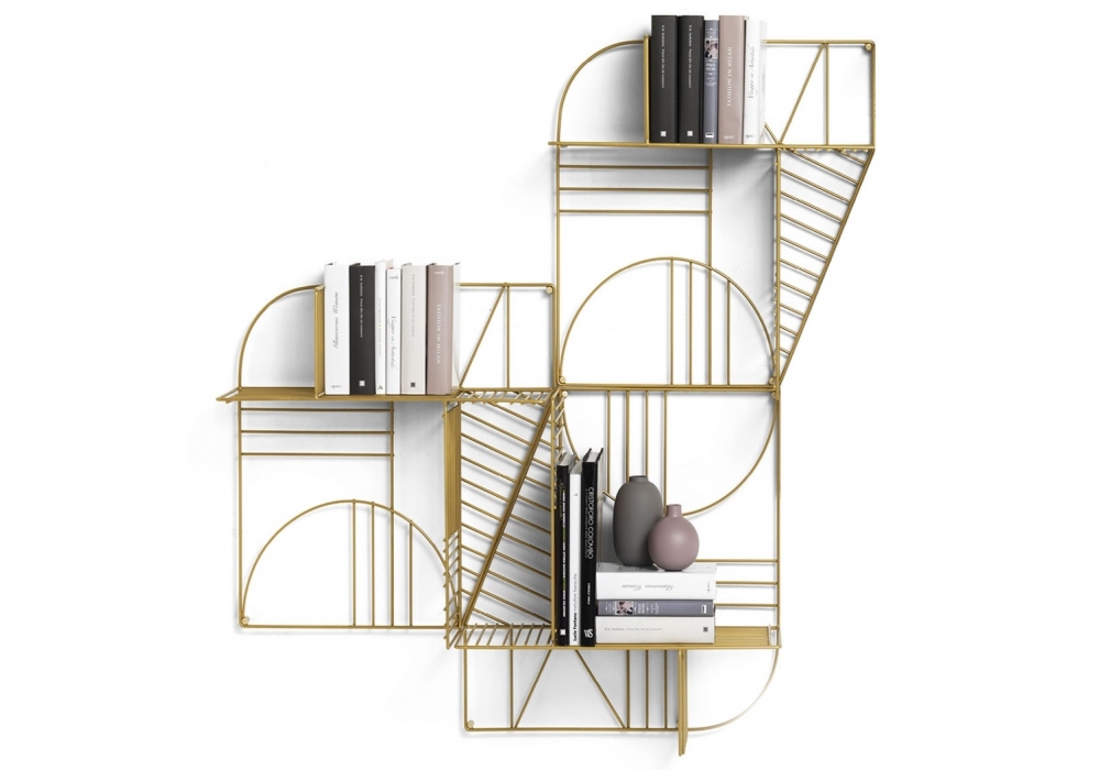 Musa diseñada por Naessi para Mogg es una estantería de pared en metal pintado oro satinado mate o negro RAL 9017. Durante el montaje es posible fijar la balda en 4 posiciones diferentes, girándola 90 °.