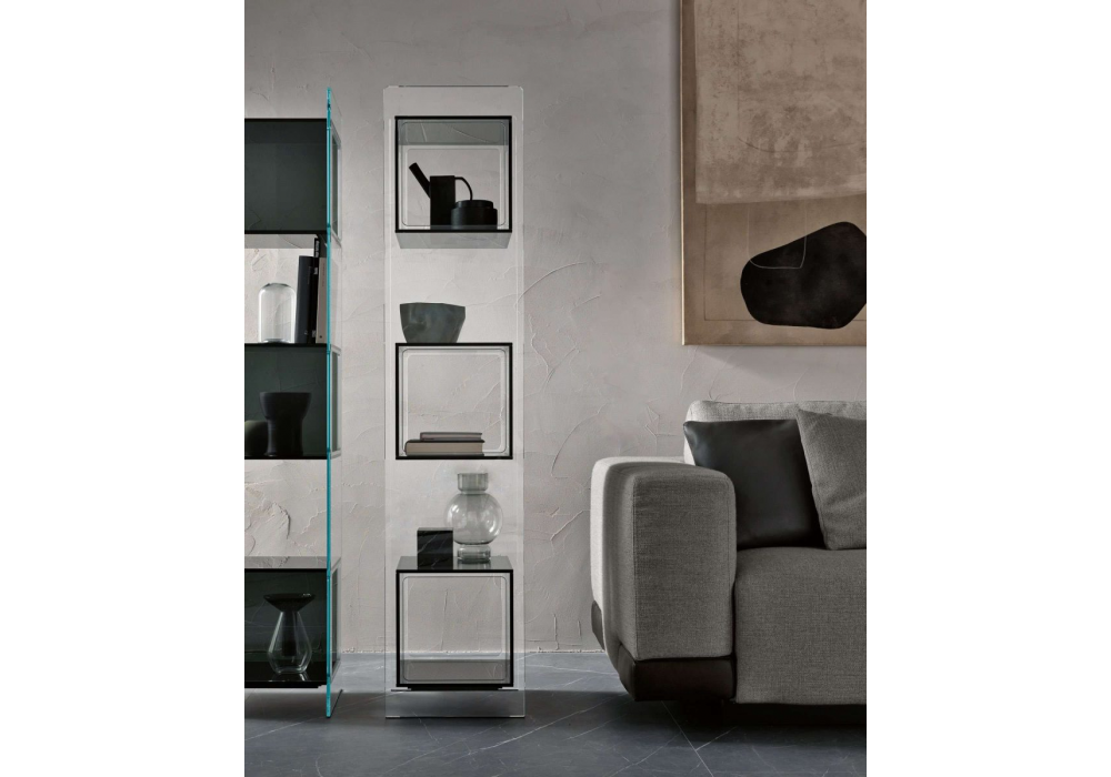 Magique Totem diseñada por Studio Klass para Fiam es una vitrina con cubos contenedores de cristal soldado realizados en diferentes acabados. Estructura en cristal extralight o ahumado.