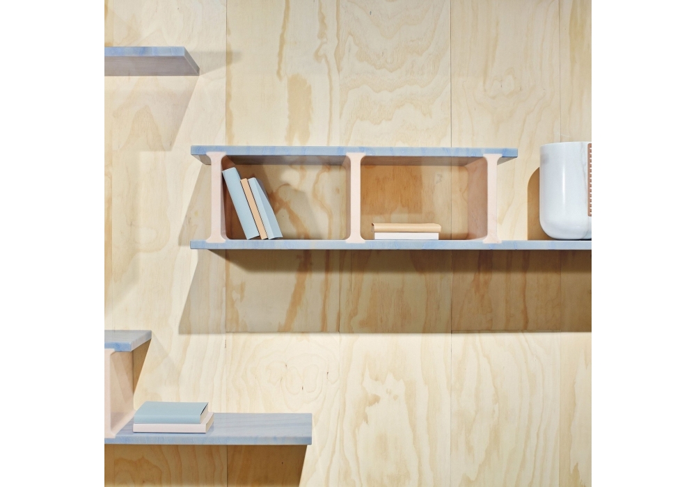 Rabbet diseñada por Patricia Urquiola para Budri es una estantería realizada en mármol Azul Macaubas y Rosa Portogallo. También disponible en 3 modelos.