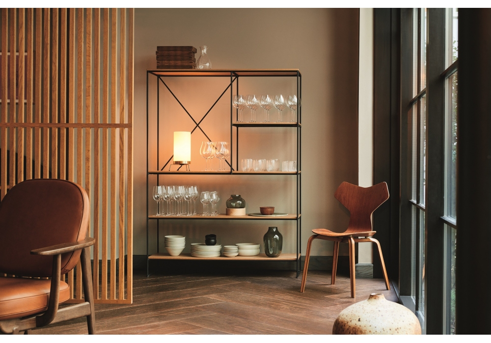Planner™ firmado por Paul McCobb para Fritz Hansen es un sistema de estantes con estructura en acero con recubrimiento en polvo negro y estantes en chapa de roble. Disponible en tres modelos.