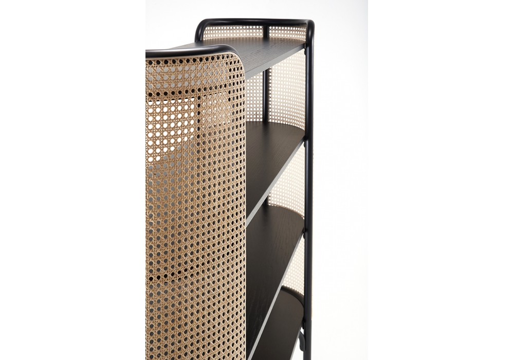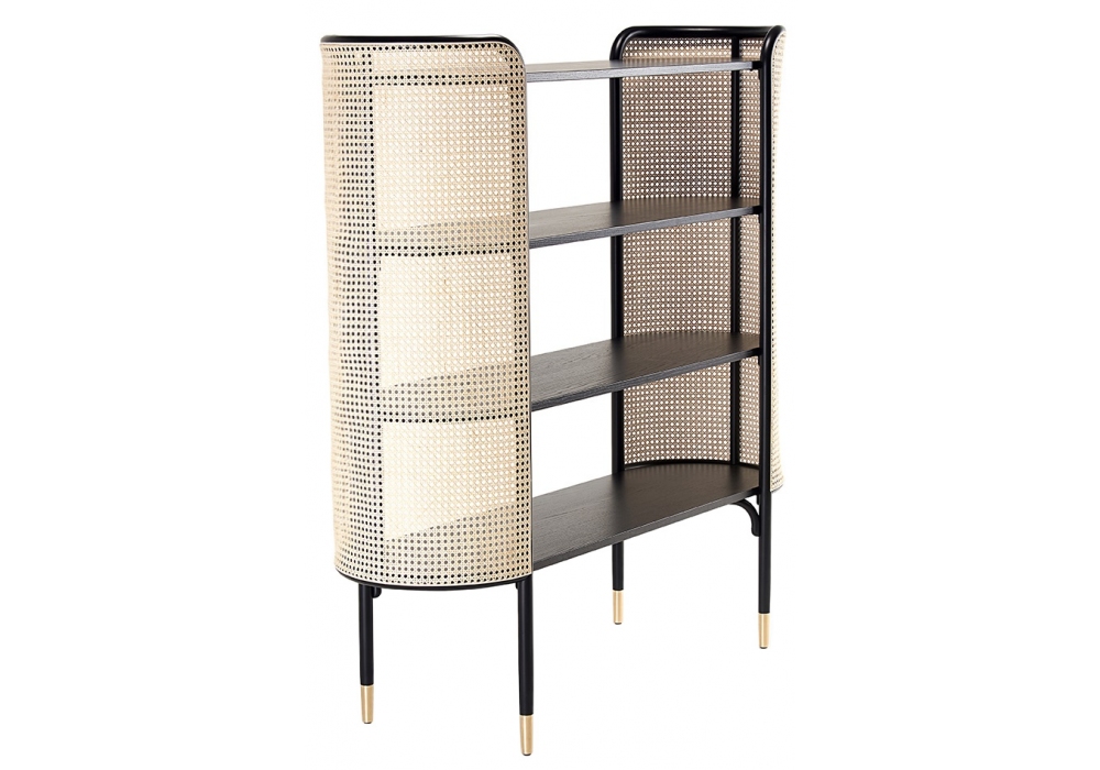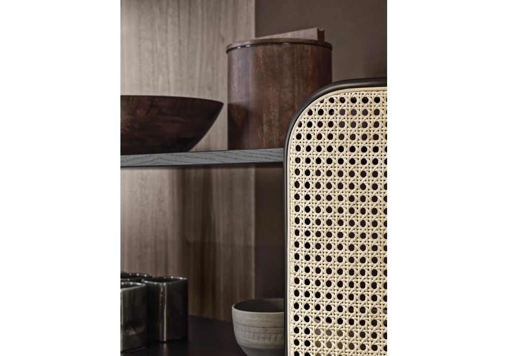 Mos diseñada por GamFratesi para Gebrüder Thonet Vienna es una librería con estructura de madera de haya curvada e inserciones de caña tejida. Estantes pintados a poro abierto en chapa de fresno. Pies de latón.