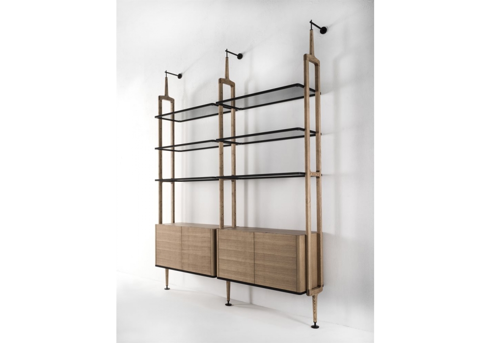 Aria diseñada por D. Dolcini para Porada es una librería modular con columnas portantes en fresno y fijación a techo o pared. Es posible personalizar la composición a través de baldas en fresno o cristal ahumado, cajoneras y contenedores en fresno soportados por una estructura de metal negro mate. Para otras composiciones contacte con el servicio al cliente.