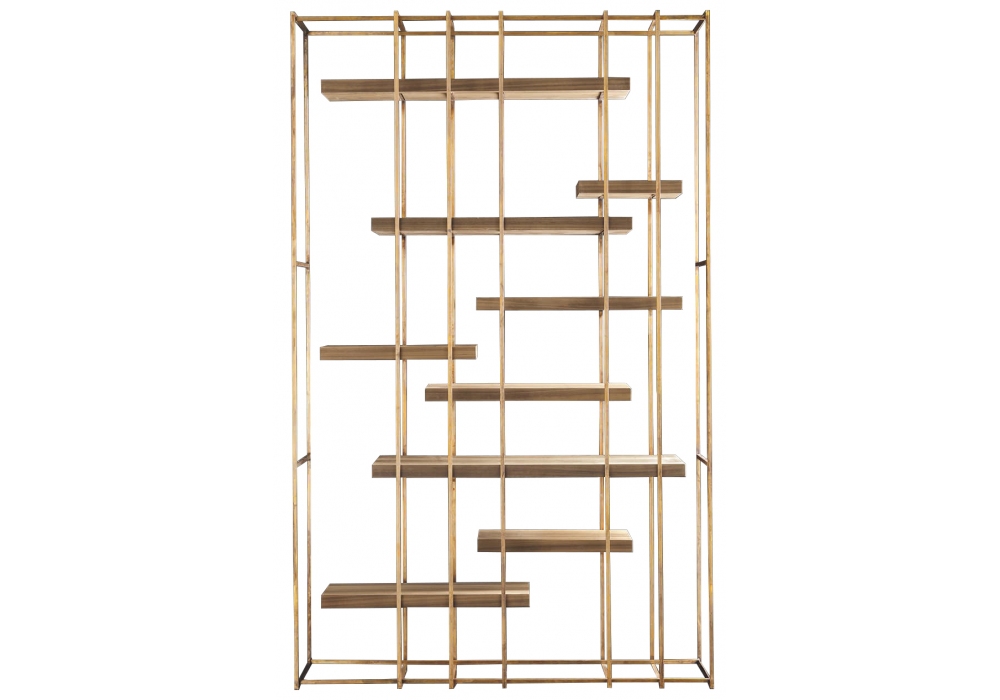 Cage-B diseñada por Massimo Castagna para Henge es una estantería compuesta por una estructura en latón bruñido y estantes de madera. Disponible en diferentes acabados y medidas.