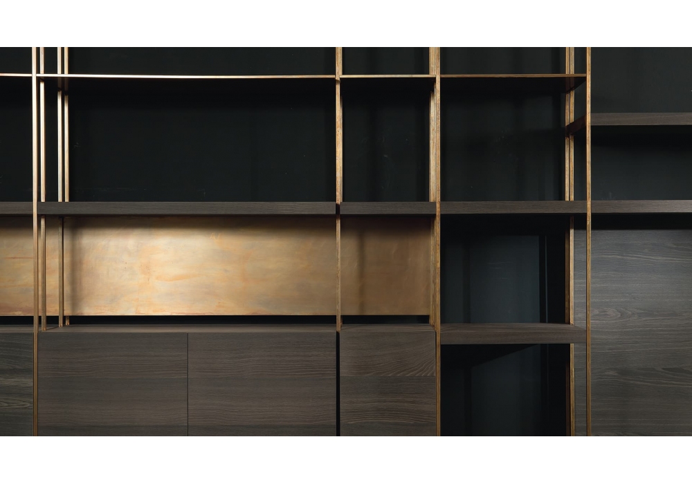 Cage-C diseñada por Massimo Castagna para Henge es una estantería compuesta por una estructura cuadrada de tubo de latón pulido a mano y estantes de madera tratada térmicamente o madera de pantano.