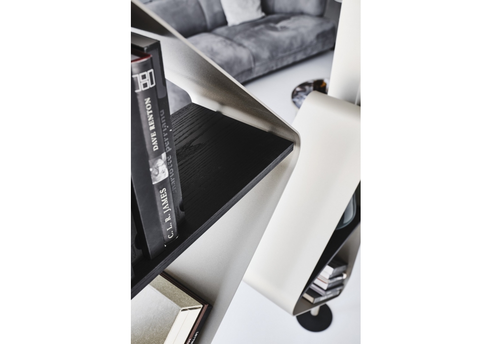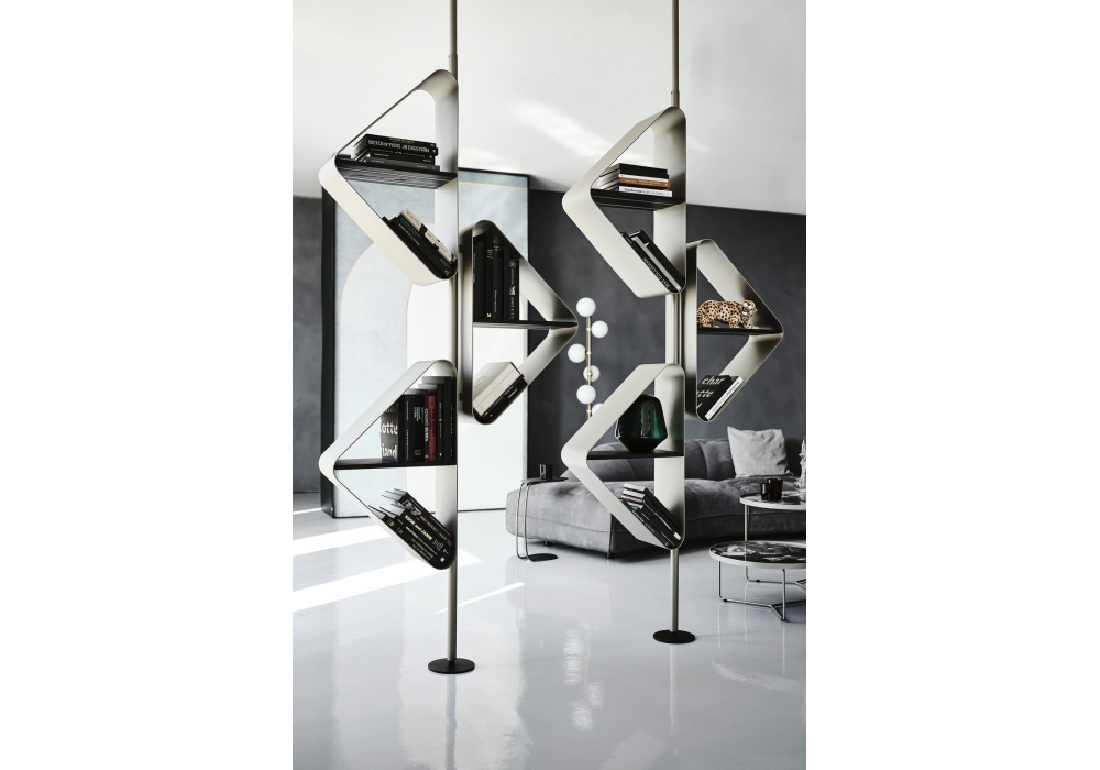 Spinnaker diseñado por Tosca Design para Cattelan Italia es una estantería en versión con montaje a pared o a techo. Es realizada con estructura de acero lacado gofrado y estantes de madera disponibles en las siguientes combinaciones: negro con estantes en Noce Canaletto y detalles en titanio o titanio con estantes en Olmo negro poro abierto y detalles en negro.