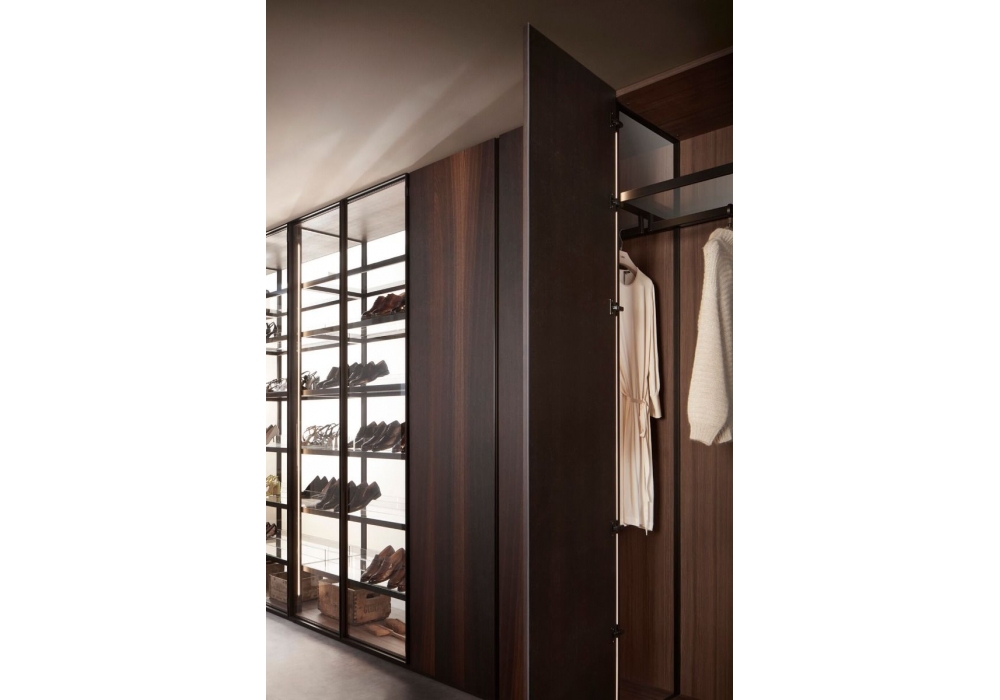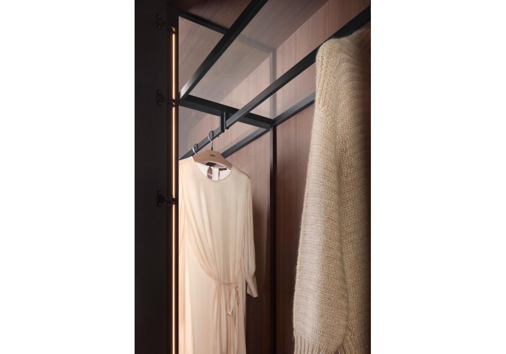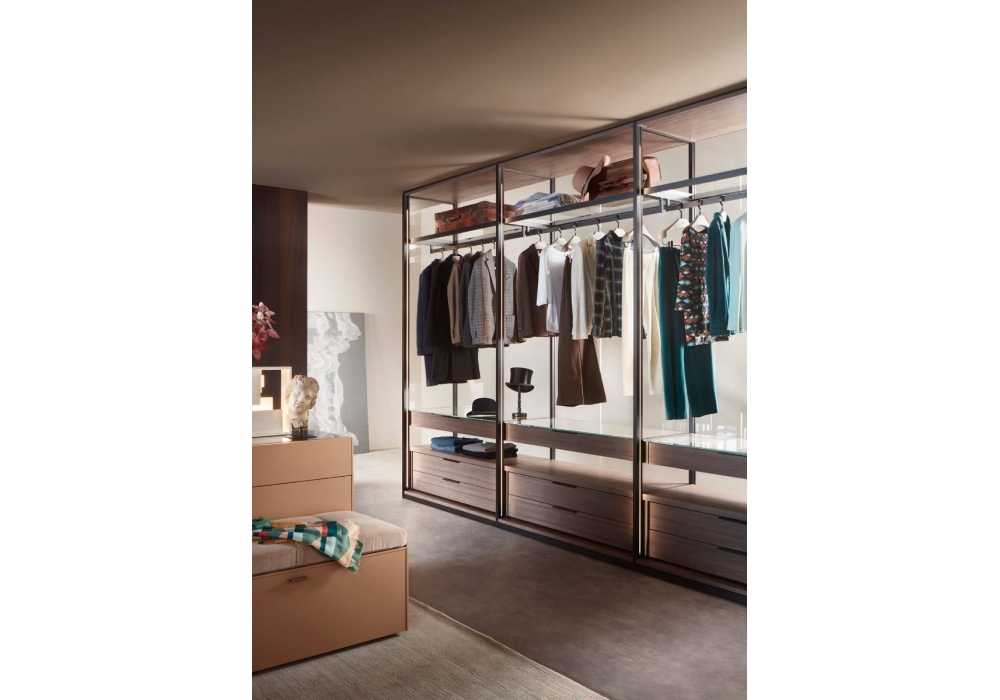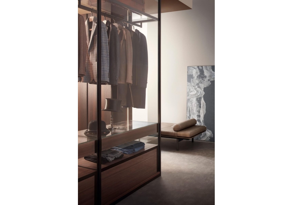 Armadio al Centimetro diseñado por Lema es un sistema modular con un marcado carácter contemporáneo, innovador desde el punto de vista tecnológico, resultado del desarrollo de un conjunto de cerramientos de aluminio, disponible en dos acabados: bronce y arena. El respaldo externo está cerrado por un respaldo de vidrio, que puede ser reemplazado por el tradicional panel posterior de melamina y está disponible en tres acabados de transparencia, en cuanto al lado del terminal: vidrio transparente extraligero, vidrio bronce reflectante y vidrio ahumado gris.