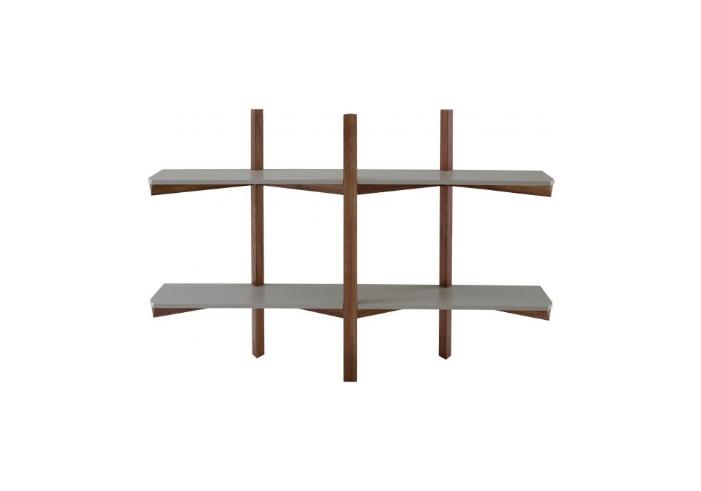 Biplan diseñado por Atelier BL 119- Blain & Dixneuf para Ligne Roset es un estante de pared con estructura en madera de nogal americano maciza barnizada natural y estantes en MDF lacado gris seda satinado.