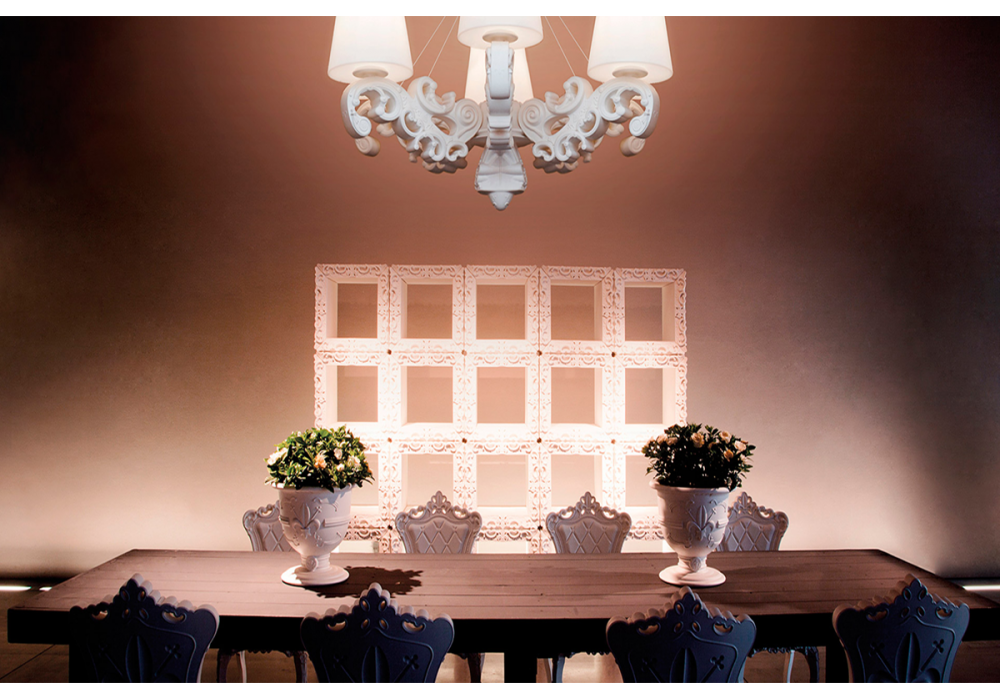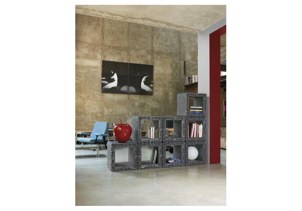 Joker of Love diseñada por Graziano Moro & Renato Pigatti para Slide es una librería modular que se puede utilizar para componer y amueblar cualquier tipo de espacio según sea necesario Con sus formas articuladas y complejas de estilo rococó, el Joker of Love se puede combinar con otros módulos para convertirse en librería, separador de espacios abiertos, archivo de oficina o como armario individual. Disponible en diferentes acabados