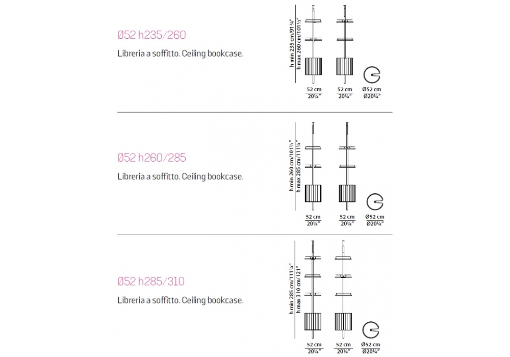 | Dimensiones | Ø 52 x H 235/260 cm; Ø 52 x H 260/285 cm; Ø 52 x H 285/310 cm. |