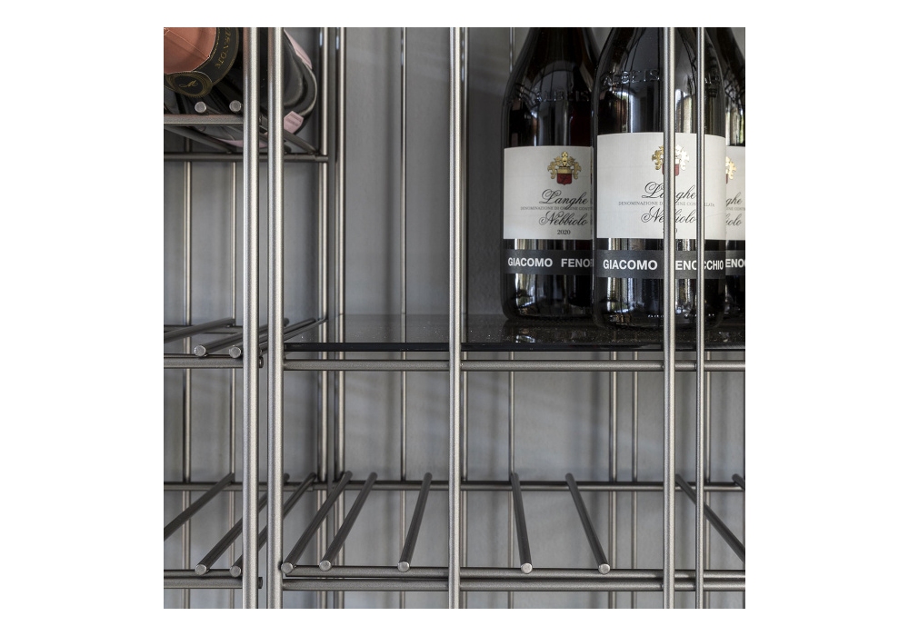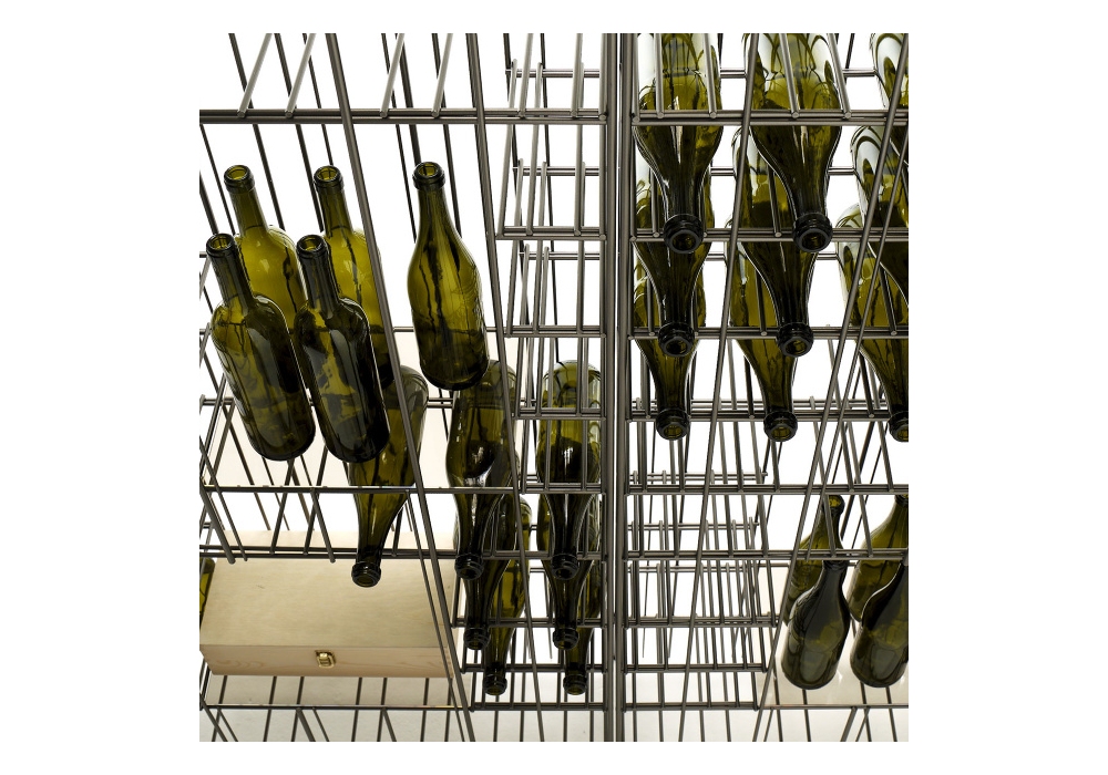 Metrica Wine diseñado por CTRLZAK para Mogg es un botellero de pie en metal acabado bruñido. Pies regulables, 2 ganchos de seguridad de fijación a pared y 2 juntas de unión incluidas. Completo con 3 estantes de bronce o vidrio verde y botelleros. Requiere montaje en pared. Disponible en 2 dimensiones.
