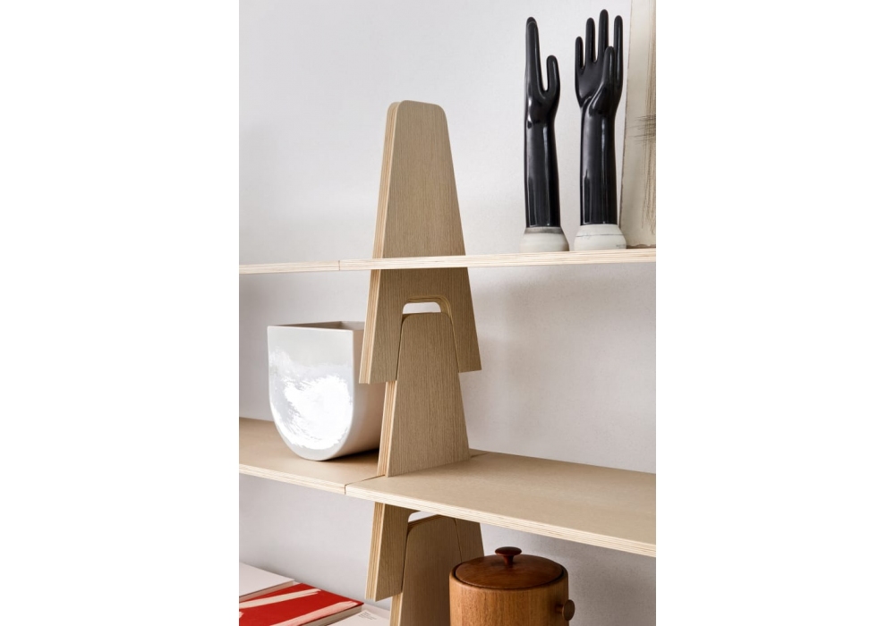 Cavalletto diseñada por Angelo Mangiarotti para Agapecasa es una librería modular realizada con elementos verticales apilables de madera contrachapada de abedul en diferentes acabados.