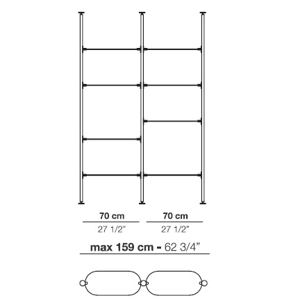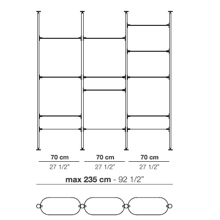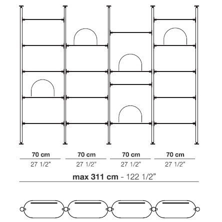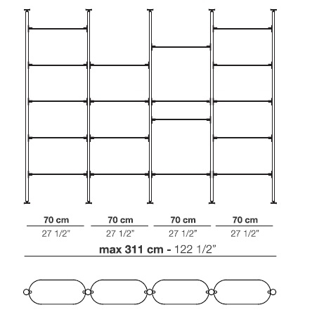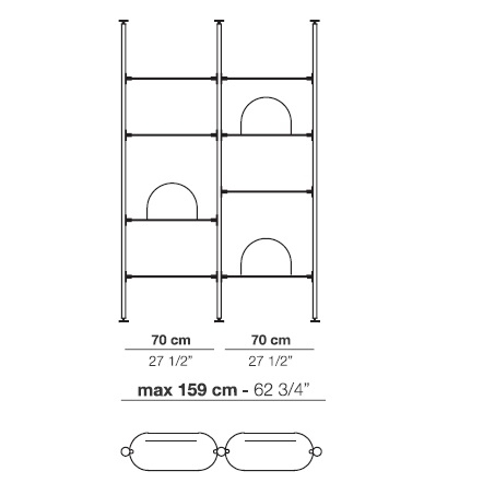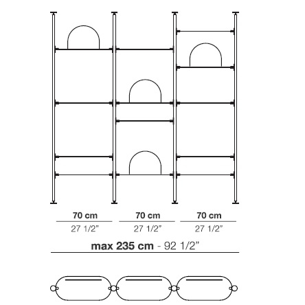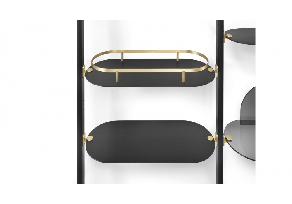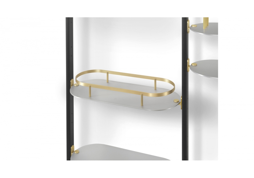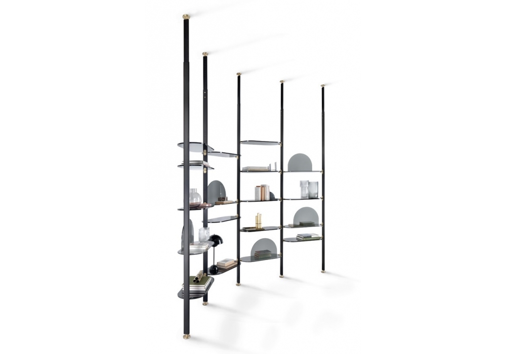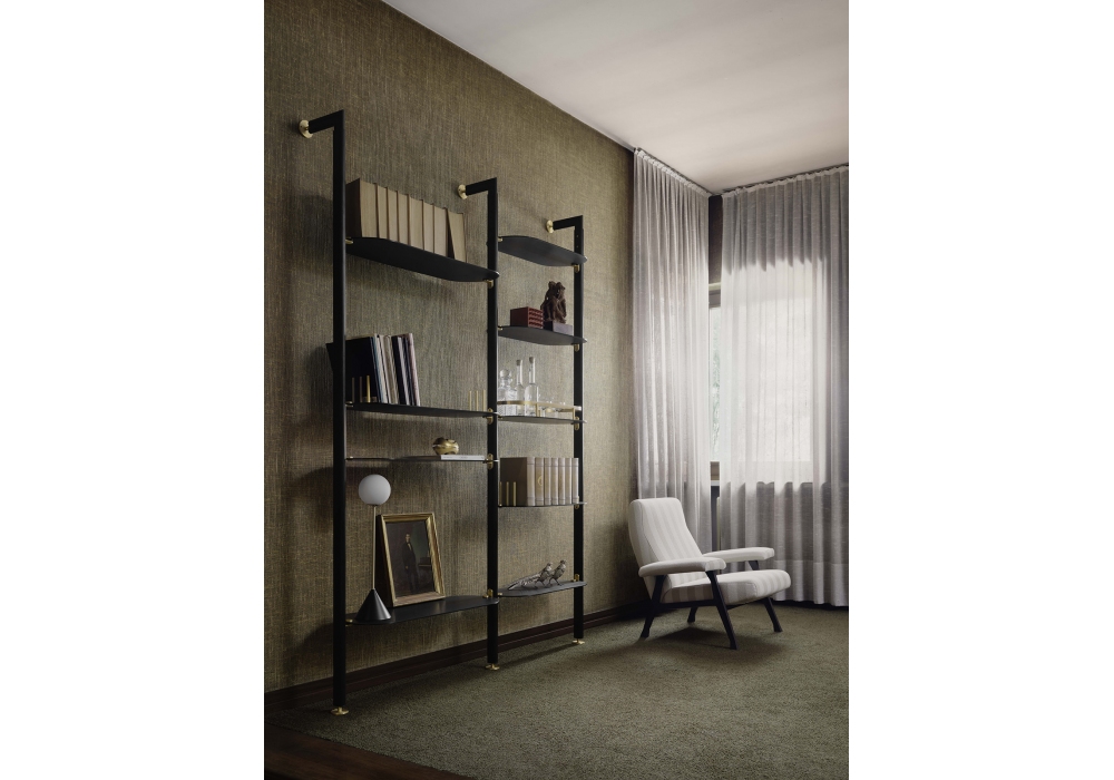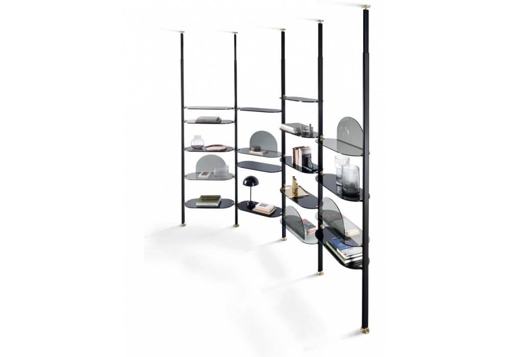 Alba diseñada por Bernhardt & Vella para Arflex es una estantería modular con fijación a techo o pared realizada con estructura de aluminio anodizado negro. Soporte de estantes y pies en latón satinado. Estantes disponibles en aluminio anodizado satinado o aluminio anodizado satinado negro.
