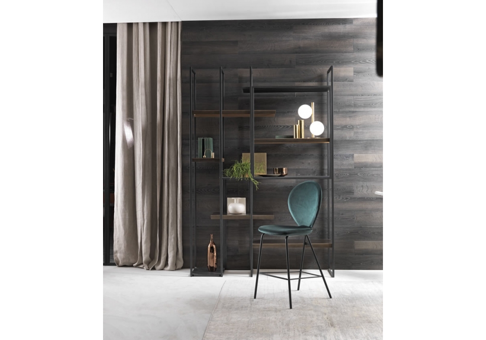 Freewall diseñada por Riflessi es una librería realizada con una estructura de metal pintado en grafito. Estantes en acero pintado graphite o en latón cepillado a mano. Disponible en 2 dimensiones.